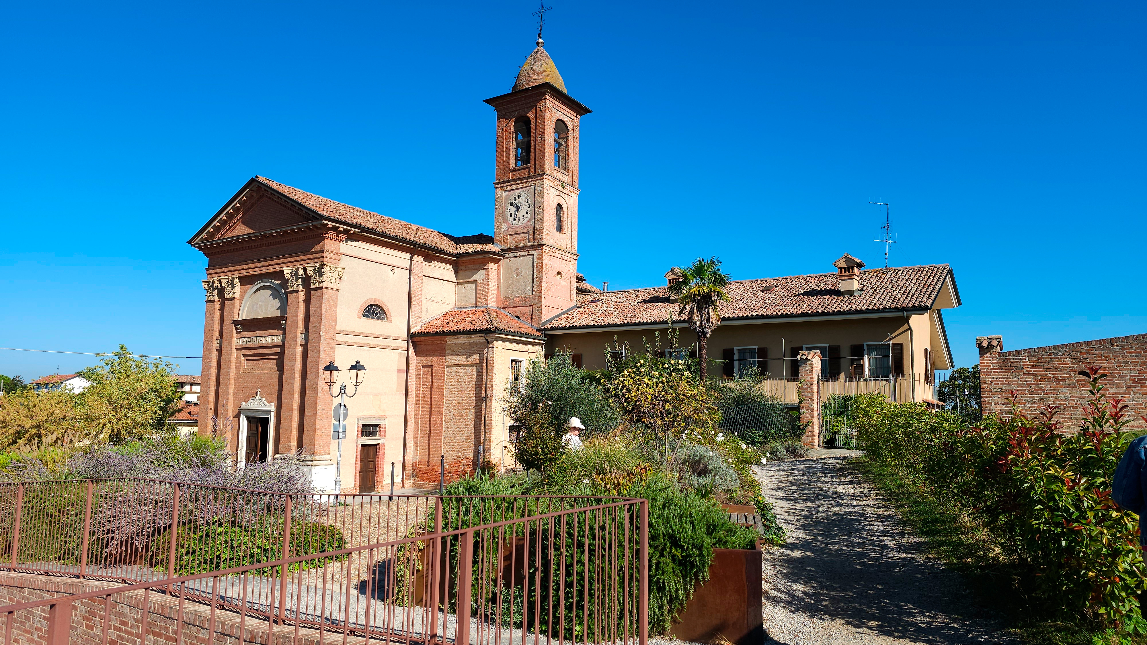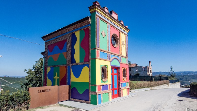 А это прямо на дороге среди виноградников стоит очень забавная часовня Бароло (La Cappella del Barolo). История у нее такая. В 1970 году британцы купили здесь шесть гектаров виноградника Брунате, на землях которых стояла эта полуразрушенная часовня. Первоначально ее использовали в качестве склада (в нее отлично помещался небольшой трактор).
