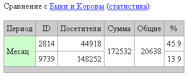 Во-первых, теперь каждый владелец листового счетчика может сравнить свою аудиторию с аудиторией любого другого сайта (входящего, разумеется, в рейтинг TopList). Между прочим, очень интересная информация. Например, сравнение моей аудитории и развлекательного ресурса "Быки и коровы"... Вот результат: