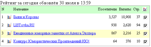 Удобно? Несомненно. И если вы открыли свои сайты одновременно с Коляном, Толяном, Серегой и Ленкой - Золотая мышка, то можете включить их сайты в свой собственный рейтинг, чтобы или торжествовать, или, в зависимости от результата, плакать горючими слезами. Кстати, через некоторое время появится возможность этот рейтинг включать прямо в дизайн вашего сайта.