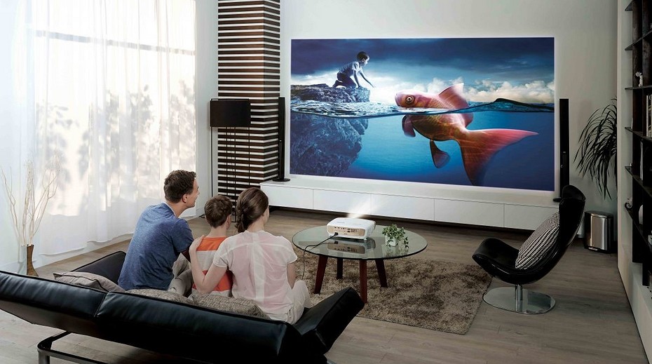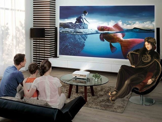 Огромное окно, масса света, проектор без источника сигнала (ну ок, вайфай и андроид на борту) на стеклянном столике, проектор слишком близко но не лазерный, из объектива вырывается чуть ли не бластерный луч, семья завороженно смотрит статическое изображение.