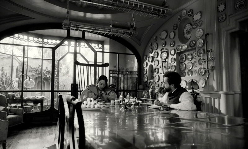 Первоначально картина снята в черно-белой гамме - ну, типа как ребенок первоначально не различает цвета, - а когда Белла осознает собственную сексуальность и сбегает с развратным адвокатом, этот мир окрашивается в очень яркие и даже кислотные цвета.