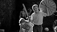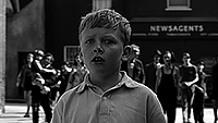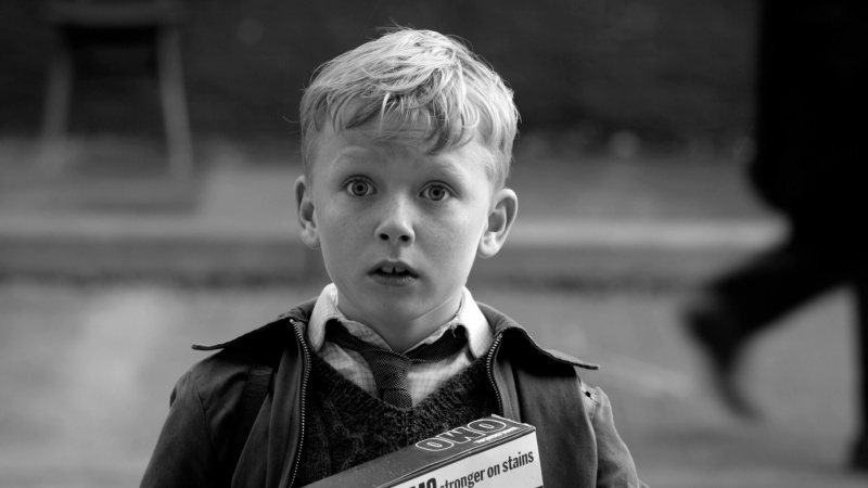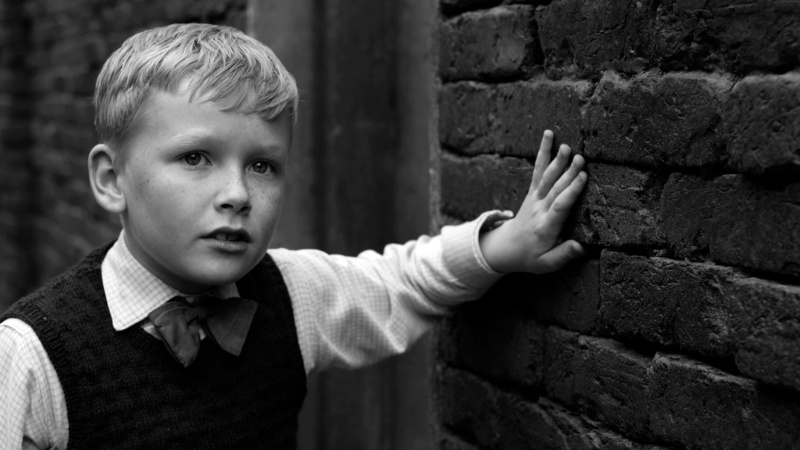 Дальше действуем по четкой схеме. Сначала в цвете показываем современный Белфаст, но тут же память нас уносит в черно-белый август 1969 года ("Рома"-то вся - черно-белая), и далее эти события мы будем показывать глазами трогательного мальчишки с обязательной щербинкой во рту, которому пришлось взрослеть, находясь внутри неприятных и опасных событий.