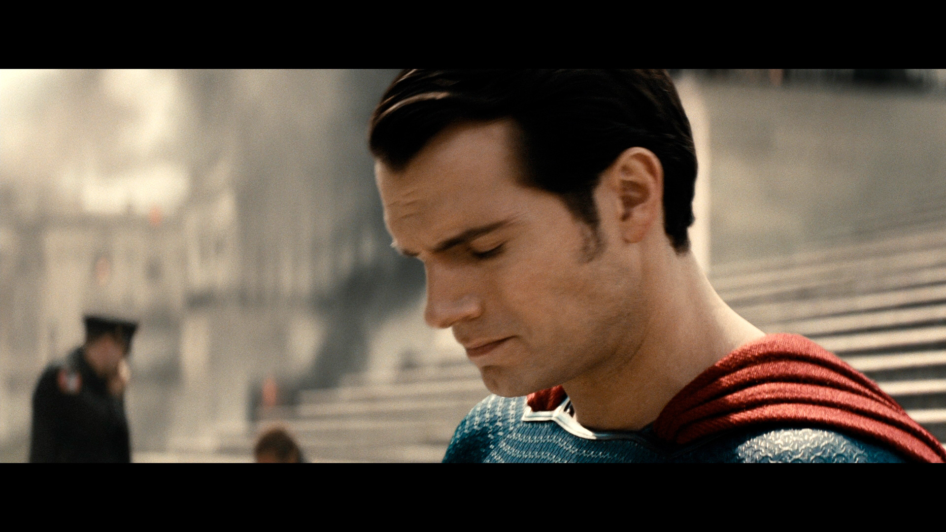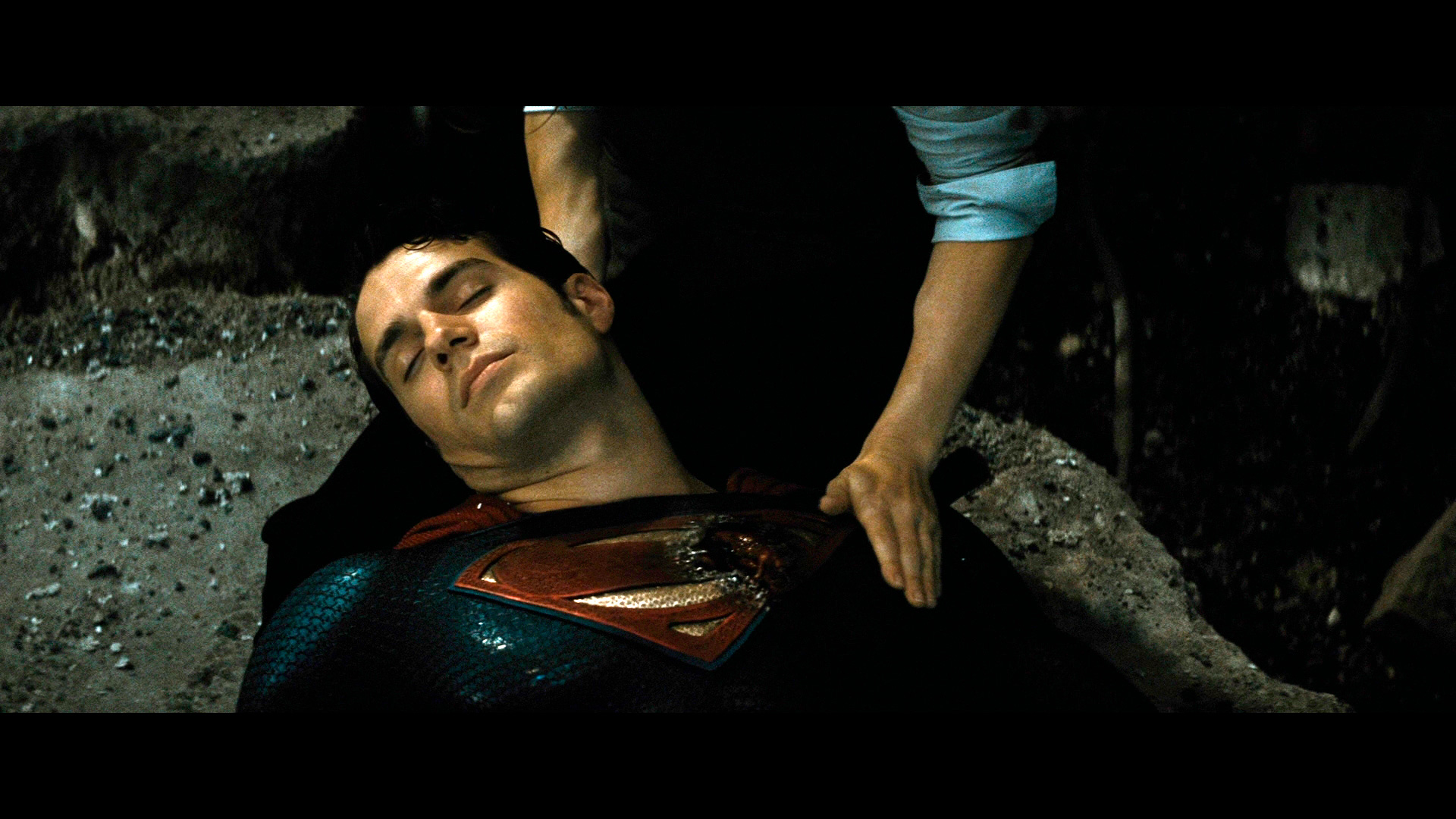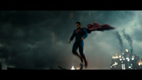 А тут еще в Готэм неожиданно прибыл человек со стальными бейцами - Супермен (Генри Кэвилл), который, правда, где-то просуперменил красные трусы, но хоть остался с плащом и с умением лететь, трогательно выставив вперед кулачок.