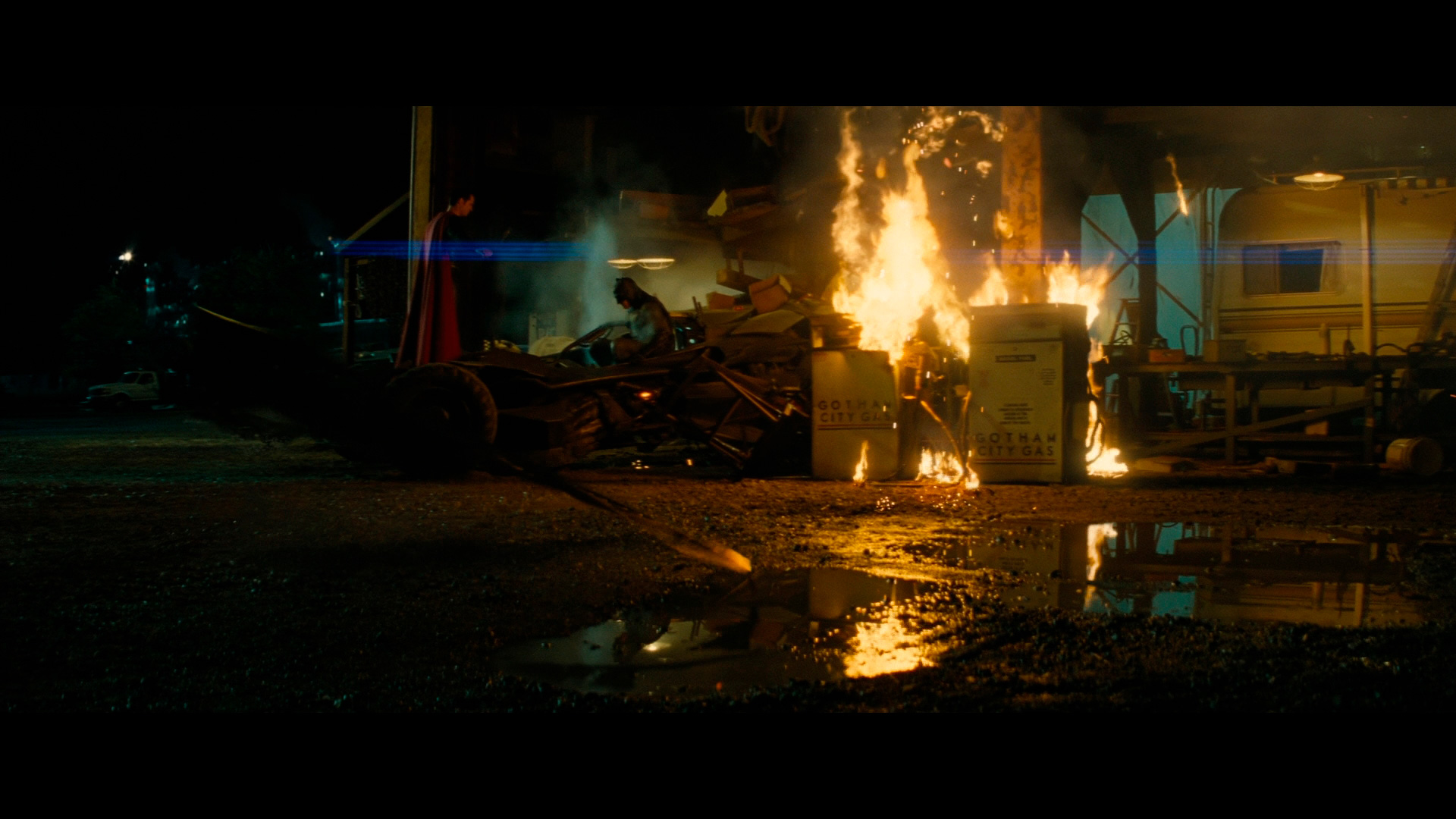 Кроме того, оказывается, что Супермен дрался с генералом Зодом прямо над небоскребом "Уэйн энтерпрайзис", в результате чего небоскреб некоторым образом был разрушен, так что Бэтмен затаил в своей душе легкую обиду на Супермена: почему он не мог, например, драться с Зодом над другим небоскребом?