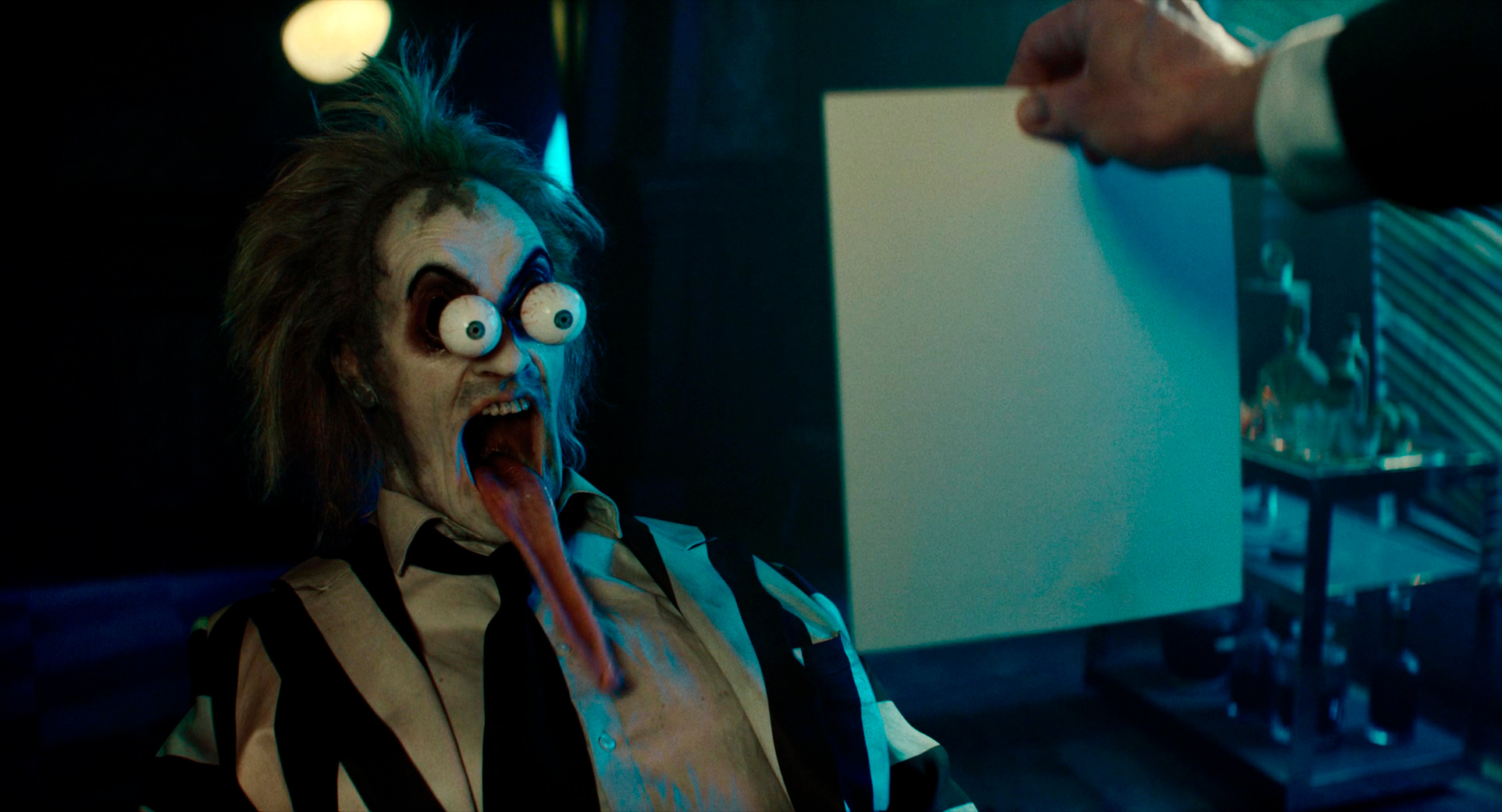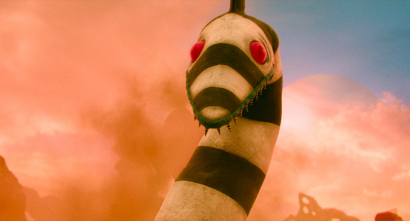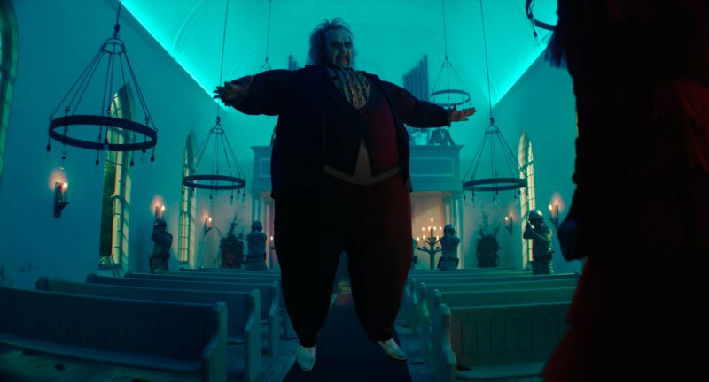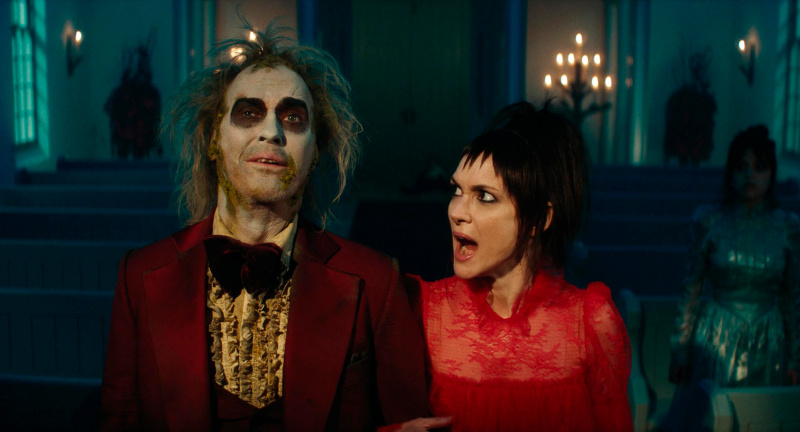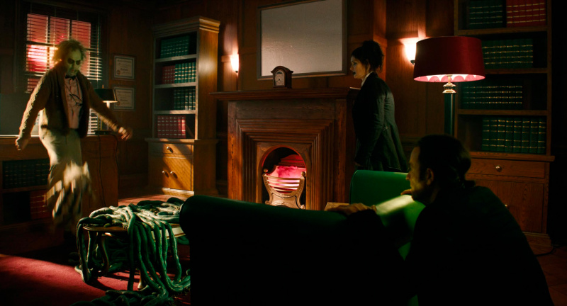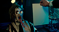 Однако Бертон сделал все правильно. Во-первых, он в сиквеле не стал использовать компьютерную графику, а, как и в первом фильме, спецэффекты - это именно работа художников и мастеров по гриму. Это видно, это заметно, и это именно такой "теплый ламповый стиль", потому что если бы это все было нарисовано, то эффект был бы совершенно другой. А так - это тот самый "Битлджюс", именно он. Только стиль съемки уже более современный.