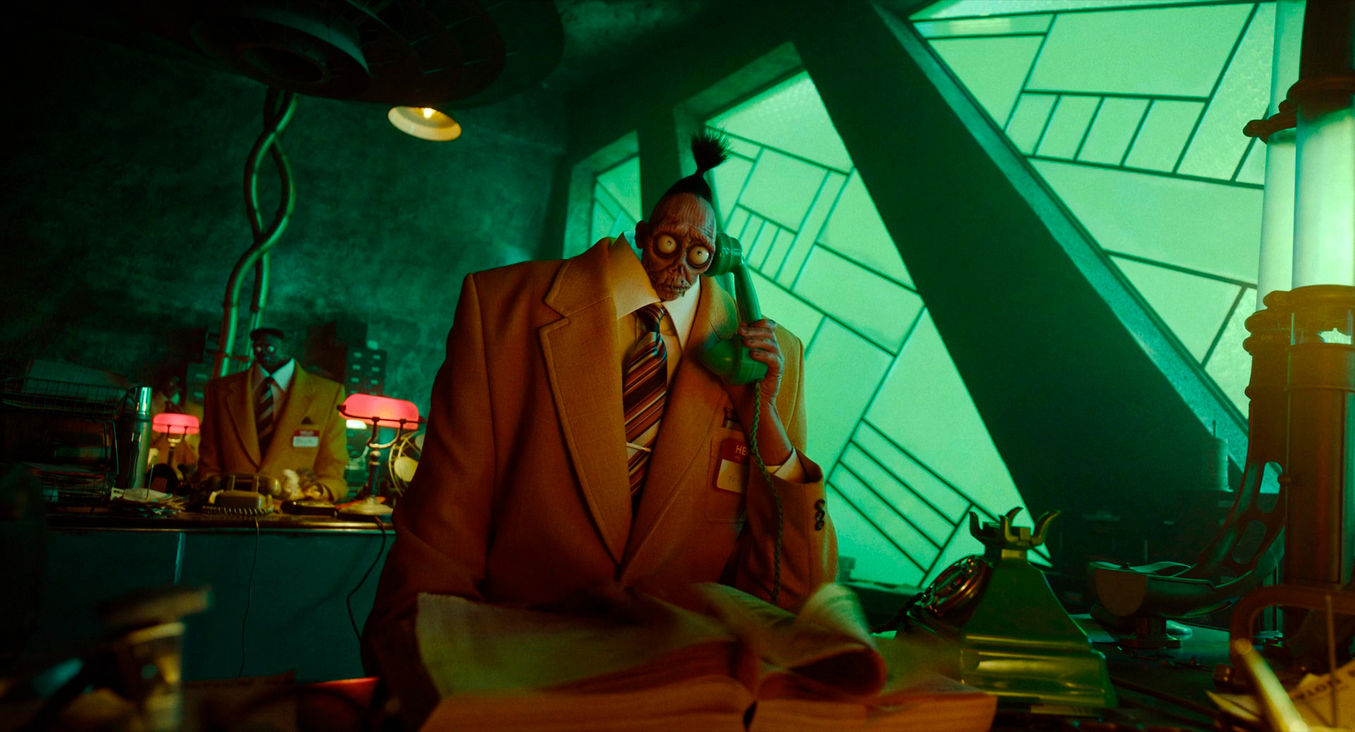 Тут все вперемешку. Несколько сюжетных линий, несколько героев, несколько конфликтов. Лидия имеет синдром непонимания с Астрид (да и с мачехой тоже, но это у них традиционное), Астрид влипает в неприятности, и ее нужно спасать, Битлджюс надеется все-таки жениться на Лидии, но его самого преследует бывшая супружница Делорес из секты пожирателей душ, саму Делорес в свою очередь преследует очень колоритный начальник загробной полиции, который в прошлой жизни был актером, изображающим крутого детектива, на Лидии, в свою очередь, хочет жениться ее продюсер, который явно гад эдакий - вы на его прическу посмотрите!