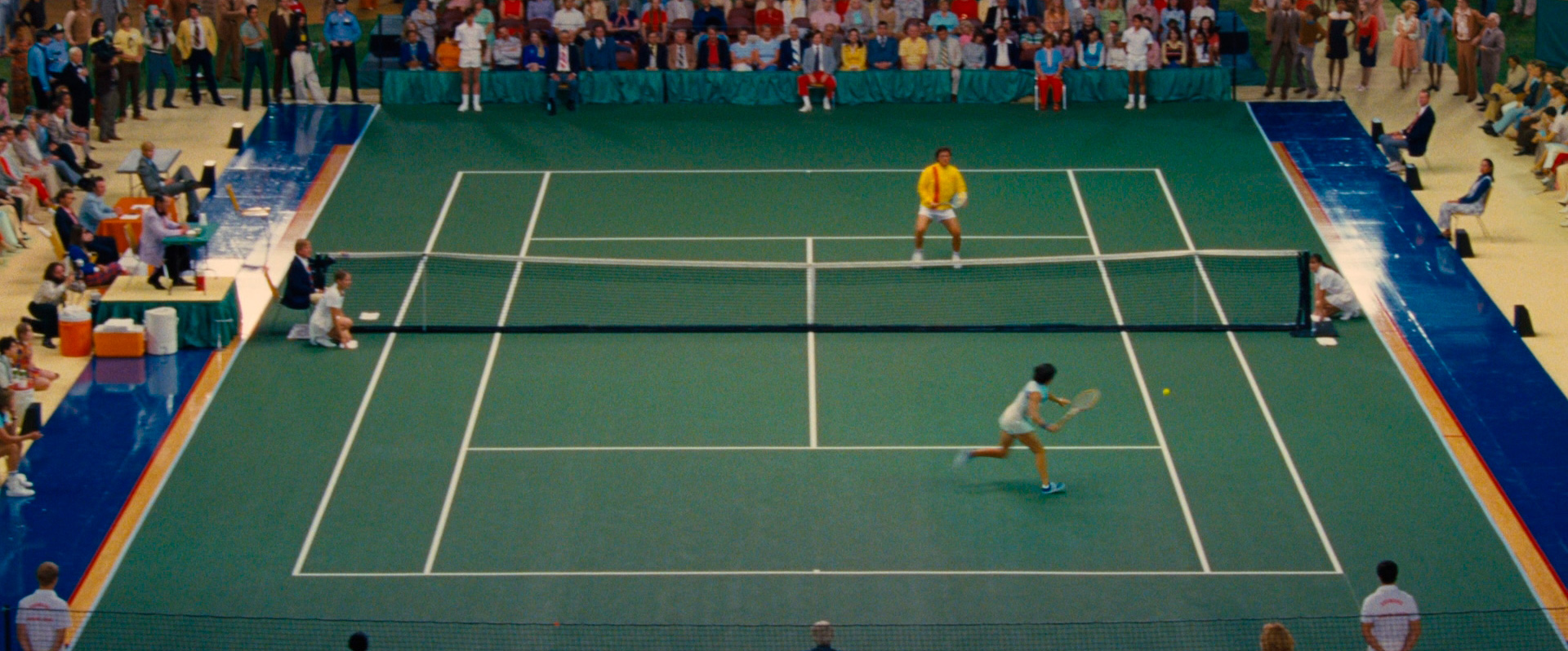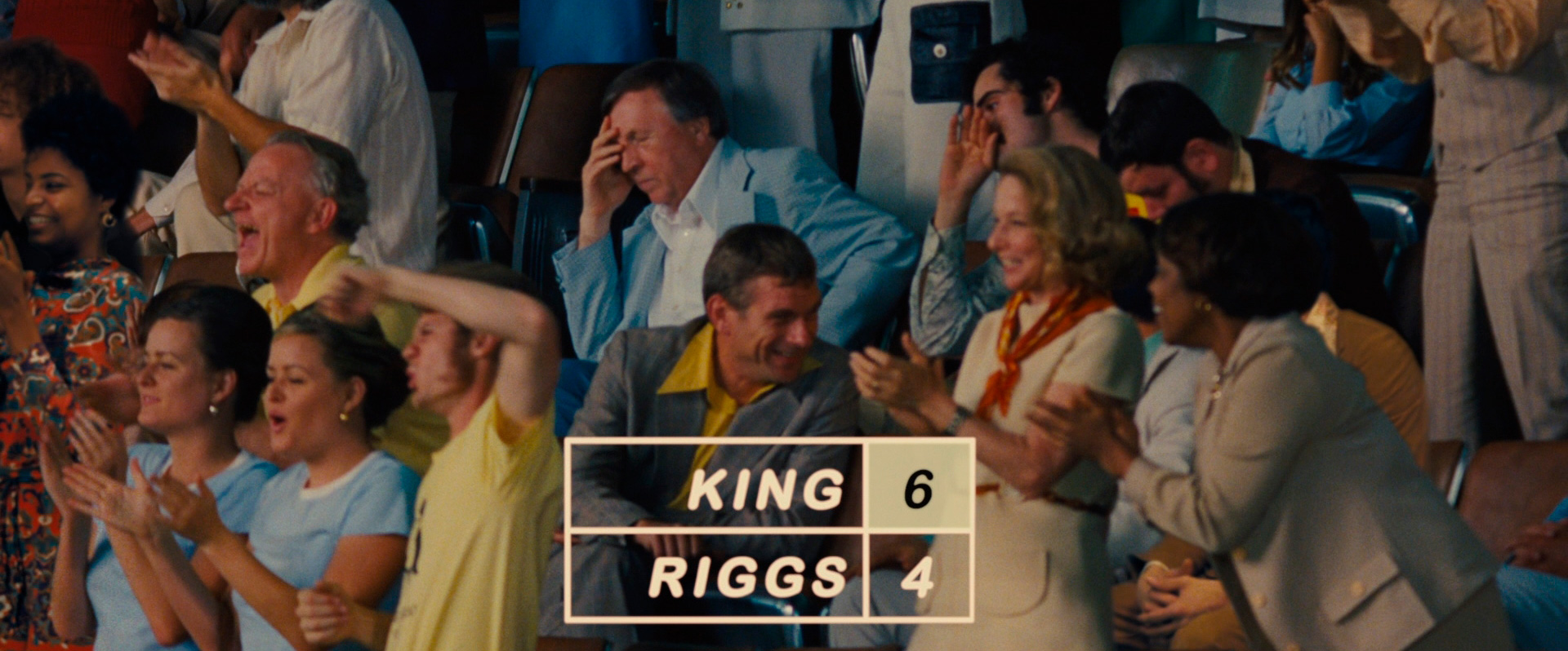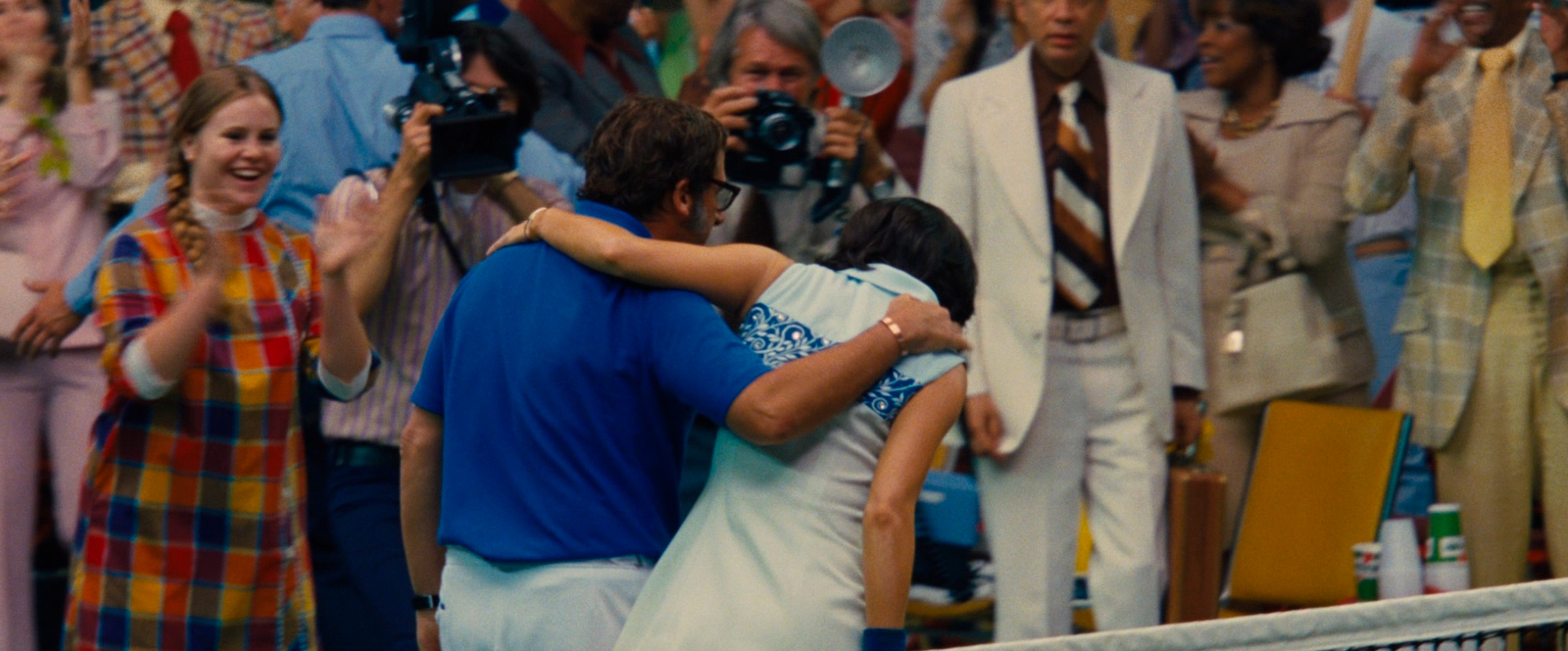 Если отрешиться от пафоса, то визуально поставлено это хорошо. Стиль семидесятых, яркие расцветки, очки в здоровенных оправах, бакенбарды у мужчин, целеустремленная Билли Джин, забавно дуркующий Бобби.