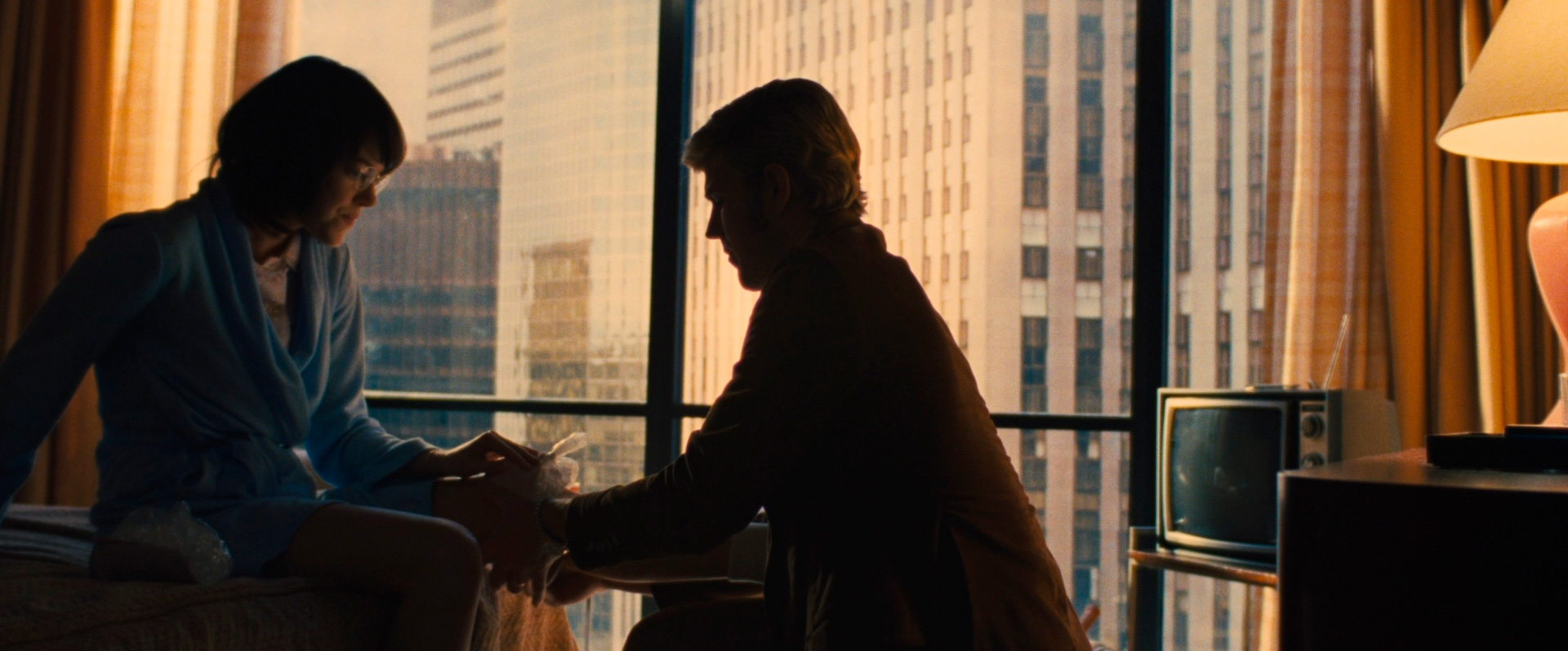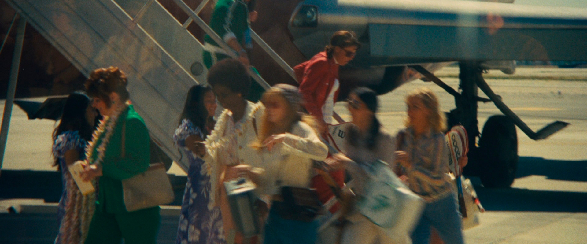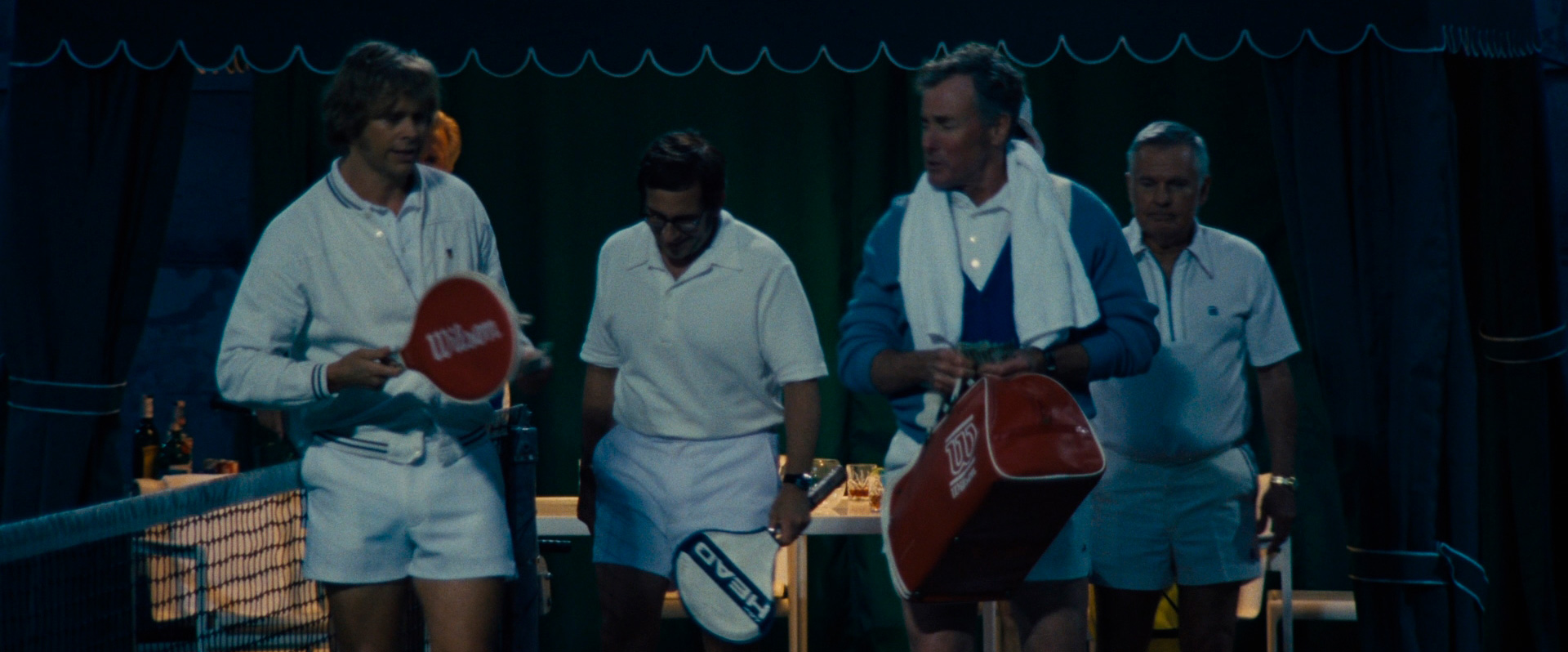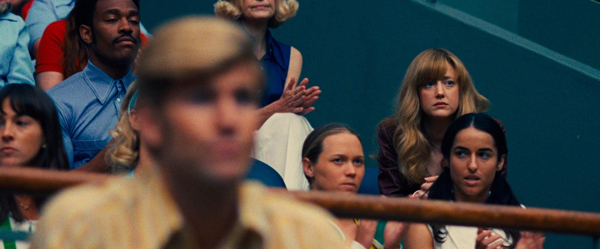 Если отрешиться от пафоса, то визуально поставлено это хорошо. Стиль семидесятых, яркие расцветки, очки в здоровенных оправах, бакенбарды у мужчин, целеустремленная Билли Джин, забавно дуркующий Бобби.