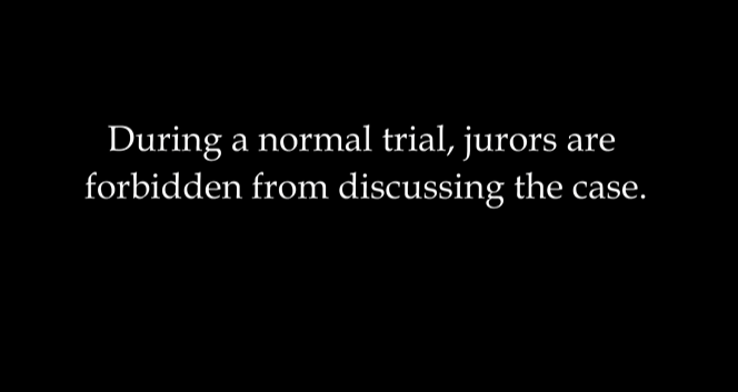 В процессе седьмой серии группа присяжных, после определенных дебатов о вердикте, который должен быть единогласным, все-таки выносит вердикт, и тут судья объявляет о том, что весь процесс был фейком, постановкой.