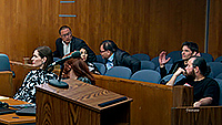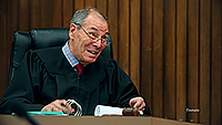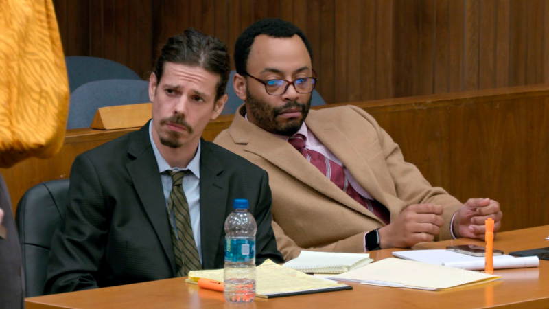 Также по сценарию в первый же день работы суда в здание пытались прорваться папарацци, чтобы запечатлеть Марсдена, и тогда судья объявил о том, что присяжные будут секвестированы, то есть разделены: это означает, что они не будут уходить домой после окончания заседаний, а их всех вместе поселят в гостинице, чтобы они не общались с посторонними. Ну и, понятно, что таким образом мы сможем следить За Рональдом и компанией и вне зала суда.