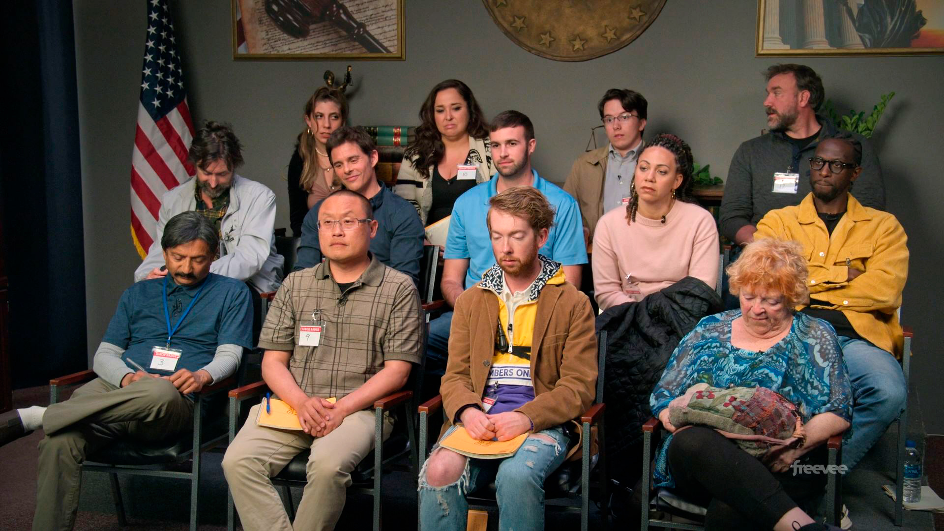 Структурно это все построено следующим образом. Каждая серия начинается с того, что присяжные выходят из отеля, садятся в автобус и отправляются в зал суда. Там проходит очередное заседание, во время перерыва присяжным предстоит решить, что они в этот день закажут на обед, а после окончания заседания киношники берут у присяжных небольшие интервью по поводу того, как прошел их день. После этого группа отправляется в отель (или куда-нибудь выпить) и киношники следуют за ними, потому что они должны фиксировать весь процесс.