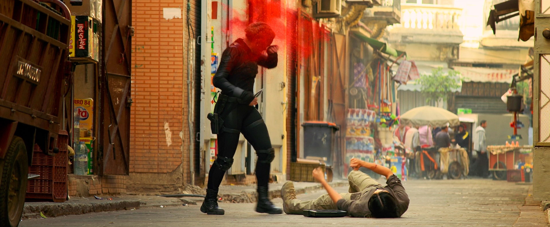 И примерно первая половина "Черной вдовы" по стилю напоминала не супергеройский комикс, а скорее более или менее реалистичный шпионский боевик вроде первой "Идентификации Борна". Наташа Романофф тут вовсе не супергерой, а женщина в депрессии, пережившая страшную травму в детстве, и никаких типовых обтягивающих черных кожанов, характерных для Черной вдовы из других фильмов, здесь не ждите.