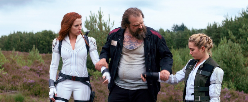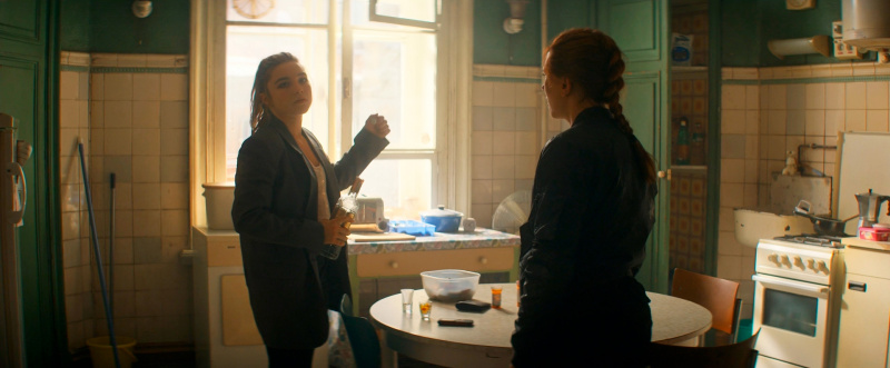 Да и, скажем честно, Наташа Романофф тут не единственная главная героиня. Зрители прекрасно понимают, что раз Наташа Романофф уже некоторым образом померла в "Мстителе: финал", то здесь это как бы закрытие гештальта с ее героиней и ее историей, но одновременно это и ввод в так называемую "Четвертую фазу кинематографической вселенной Marvel", открывающуюся отличным сериалом "Ванда/Вижн", нового персонажа, а именно Елены, которая также - бывшая Черная вдова. Поэтому Наташа с Еленой тут действуют примерно наравне, также во второй половине к ним присоединяются их назначенные Дрейковым "родители" - Алексей, он же супергерой Красный Страж, ну и ученая Мелина.