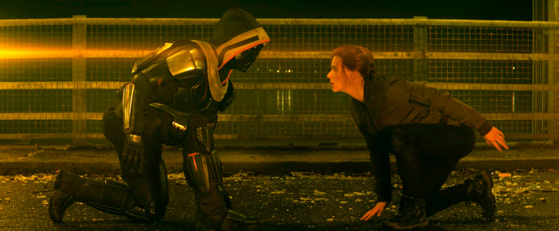 Скарлетт Йоханссон здесь сыграла вполне прилично, тем более что изображать всякие чисто человеческие чувства ей идет больше, чем образ суровой супергероини, затянутой в черный кожан. Но замечу, что и во всяких боевых сценах, коих тут также немало, она выглядела вполне достойно.
