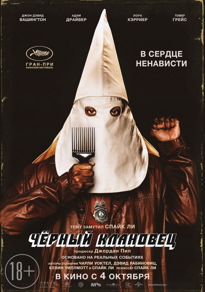 И вот теперь - "Черный клановец" (кстати, оригинальное название картины - BlacKkKlansman, где обыгрываются слова black (черный), klansman (клановец) и аббревиатура организации ку-клукс-клан).