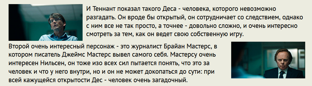 И Теннант показал такого Деса - человека, которого невозможно разгадать. Он вроде бы открытый, он сотрудничает со следствием, однако с ним все не так просто, а точнее, довольно сложно, и очень интересно смотреть за тем, как он ведет свою собственную игру.