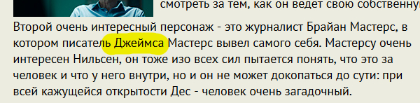Второй очень интересный персонаж - это журналист Брайан Мастерс, в котором писатель Брайан Мастерс вывел самого себя. Мастерсу очень интересен Нильсен, он тоже изо всех сил пытается понять, что это за человек и что у него внутри, но и он не может докопаться до сути: при всей кажущейся открытости Дес - человек очень загадочный.