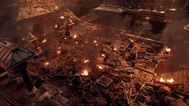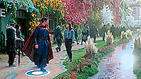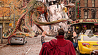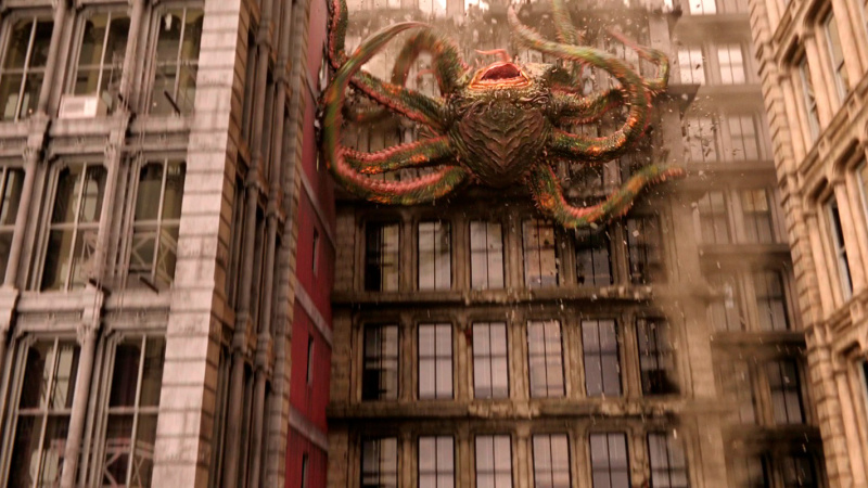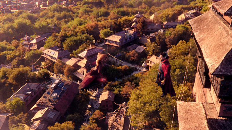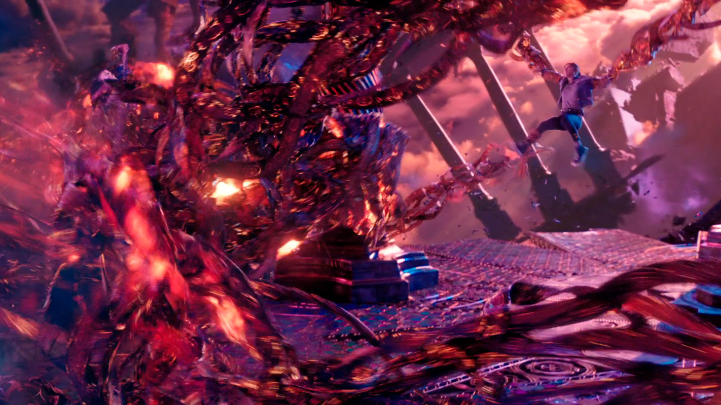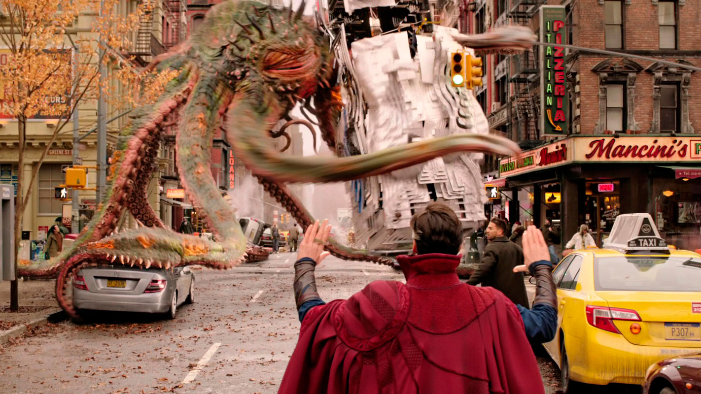 С визуальной точки зрения здесь нет такого буйства, как в первом "Стрэндже", однако то, что показали, выглядело, на мой взгляд, вполне достойно. Искореженный параллельный мир из снов Стрэнджа, гигантский осьминог, защита Камар-Таджа, очень забавный Нью-Йорк из параллельного мира Земли-838, разрушенная "сопряжением" еще одна вселенная, поединок Стрэнджа с альтернативным Стрэнджем, финальное сражение в стиле "Зловещих мертвецов" - это все выглядит очень эффектно.