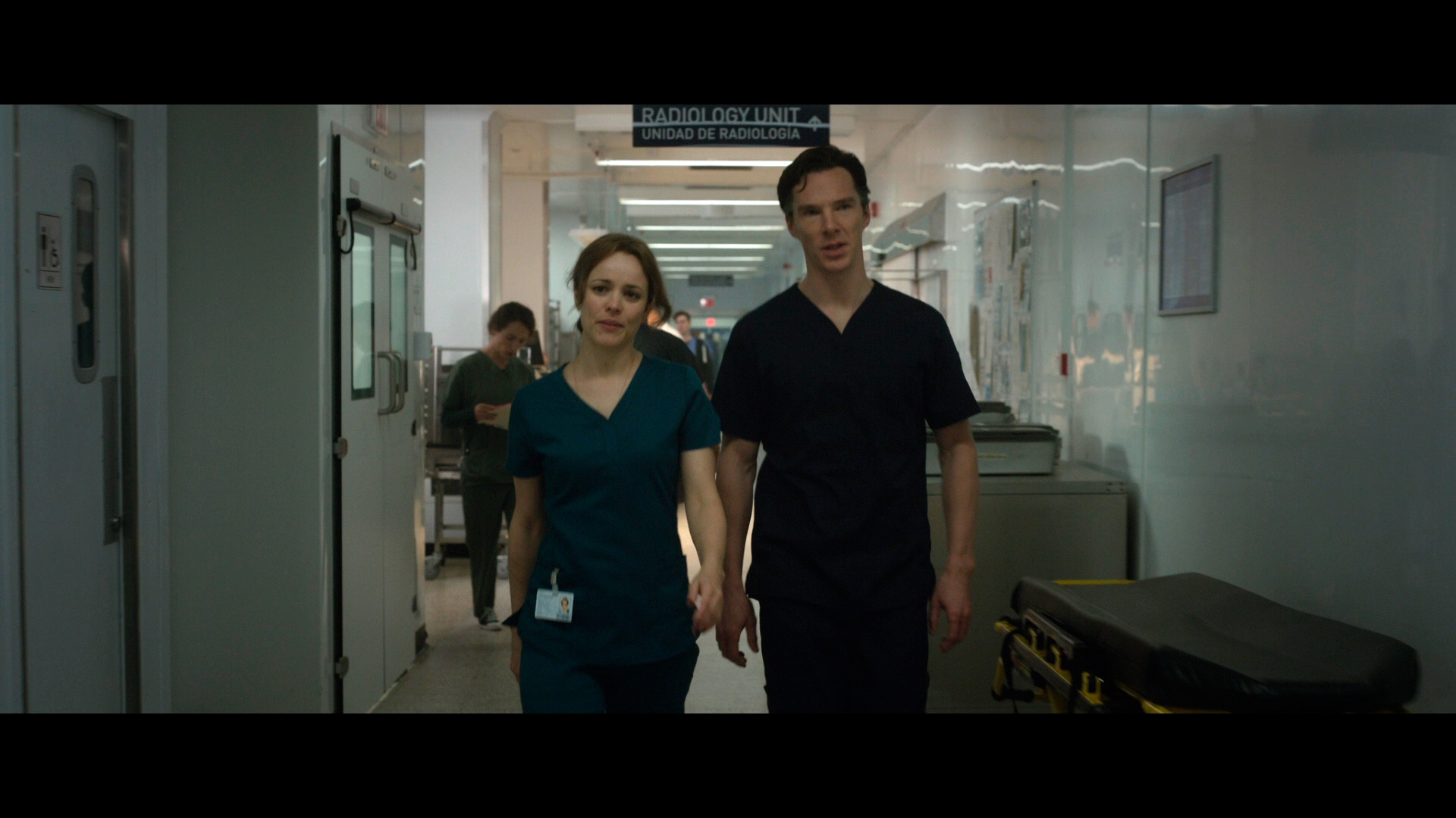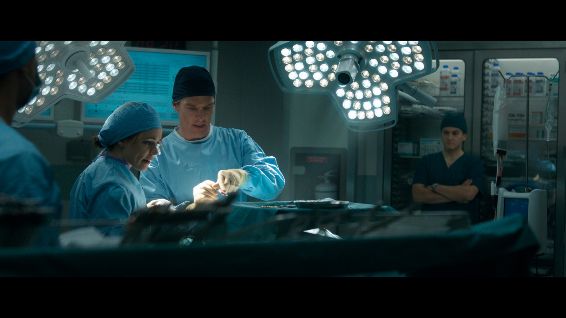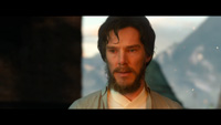 Я бы даже назвал этот устаревший предмет одежды главным героем фильма. В чем и обида, переигрывает он не только серенького актера Бенедикта Камбербэтча (Benedict Cumberbatch), но и саму леди Тильду Суинтон (Tilda Swinton). Да и, собственно, ей там нечего играть, кроме лысой головы. Она пытается серьезно произносить отвратительный бестолковый текст, часто моргает.