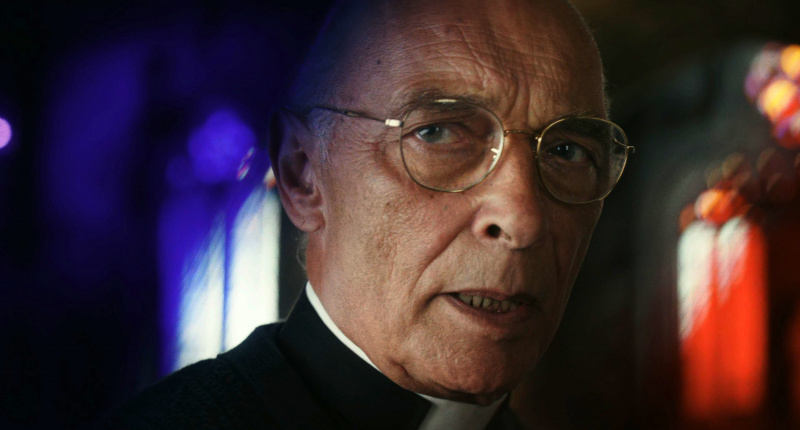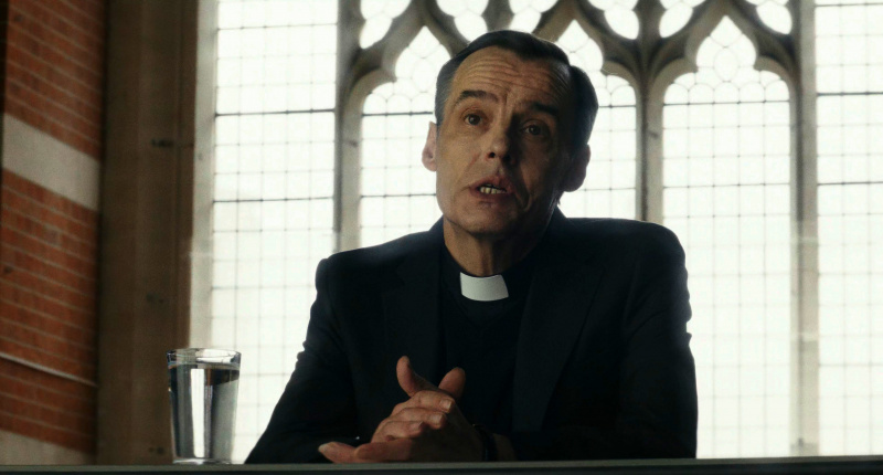 Первые сорок минут здесь идет история Джада и его служения в церкви Божьей Матери Неустанной Стойкости, где проповедует этот слегка (или даже не слегка) бесноватый монсеньор Уикс. И Джад вступает в прямой конфликт с Уиксом, ведь он парень реально боевой. И там челюсти монсеньора явно угрожала большая опасность, но все разрешилось радикальным образом: Уикса таинственно убили, и вот тут-то, ровно на сороковой минуте, в картине возник детектив Бенуа Бланк, слава богу.
