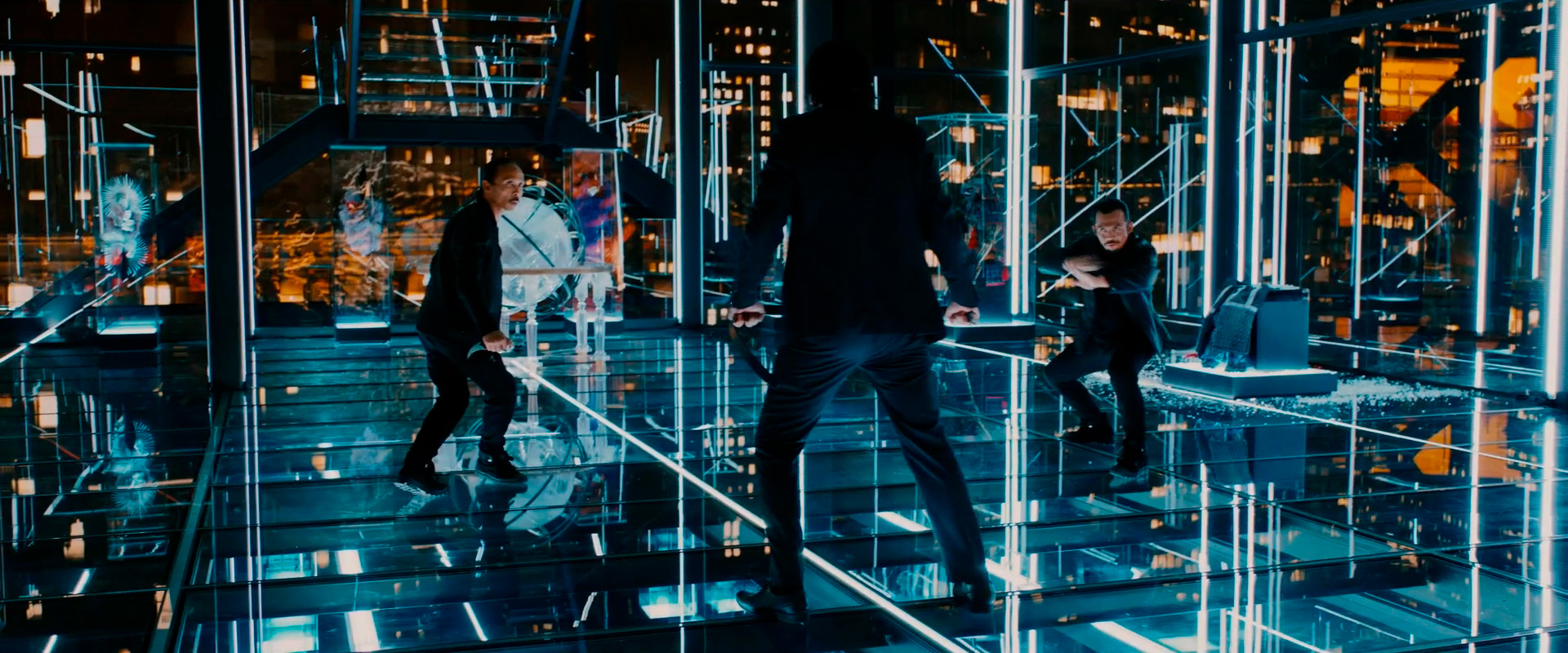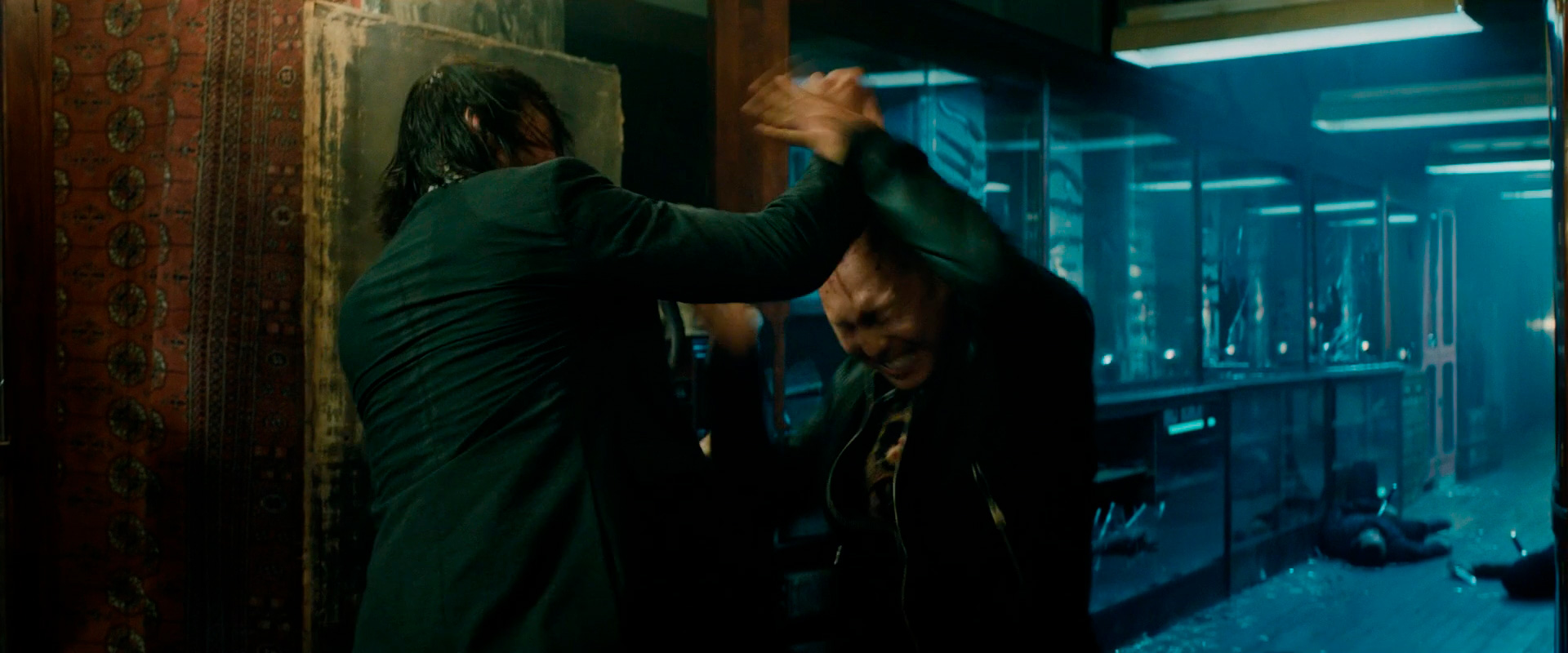 За весь фильм Уик только один раз озаботился полученным ножевым ранением и пошел его зашивать. Это старая добрая традиция: и в первом, и во втором фильме Уик тоже трогательно зашивал резаную рану, при этом Ягу совершенно не волновал тот факт, что его двадцать раз переехали тяжеленными машинами и несколько раз сбрасывали с различных этажей зданий. Здесь - все то же самое. И машинами переезжали, и в упор много раз стреляли, и с пятого этажа "Континенталя" сбрасывали с шестью пулями в тугом теле - а пофиг ему совершенно.