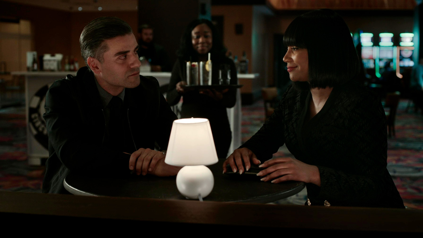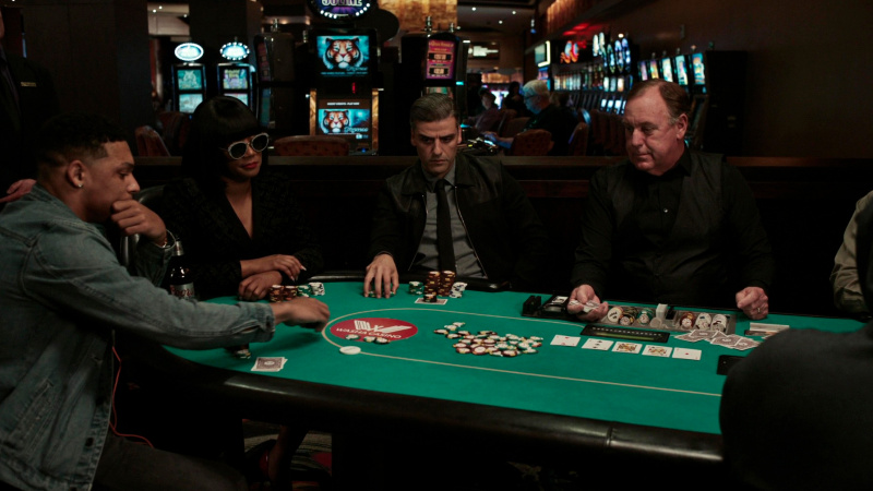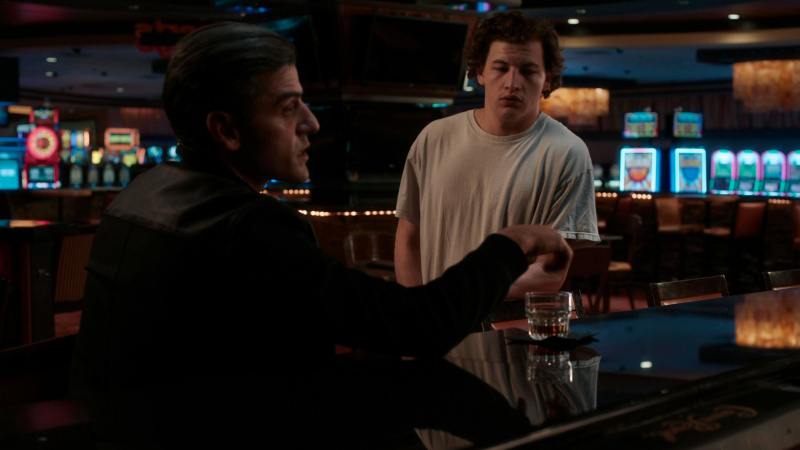 Поставлено это очень хорошо. Вроде бы почти весь фильм - похожие как две капли воды интерьеры казино Восточного побережья и безликие номера мотелей (Телл никогда не останавливается в комфортабельных гостиницах при казино), монотонные ритуалы Уильяма, слегка медитативная монотонная музыка, и даже покерные баталии показываются очень сдержанно, без какого-то саспенса, но при этом создаётся соответствующее настроение и картиной действительно проникаешься, особенно когда понимаешь, что тебе вообще хотят сказать.