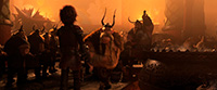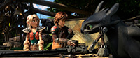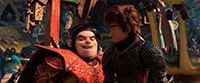 Кроме того, некоторые персонажи, которые были обозначены в сиквеле легкими штрихами, вышли на первый план, и многие из них - очень и очень забавны. Самая прикольная парочка - брат с сестрой Задирака (Джастин Раппл) и Забияка (Кристен Уиг). Задирака связывает свои длинные волосы под подбородком, делая вид, что носит бороду, и постоянно пытается наставлять Иккинга на путь истинный. А Забияка невероятно болтлива, и там самая смешная сцена в фильме - когда она попадает в плен к Гриммелю и изводит его болтовней до того, что он ее пинком отправляет на свободу. Впрочем, сцена, когда Беззубик пытается ухаживать за дневной фурией, а Иккинг ему подсказывает, тоже очень веселая.
