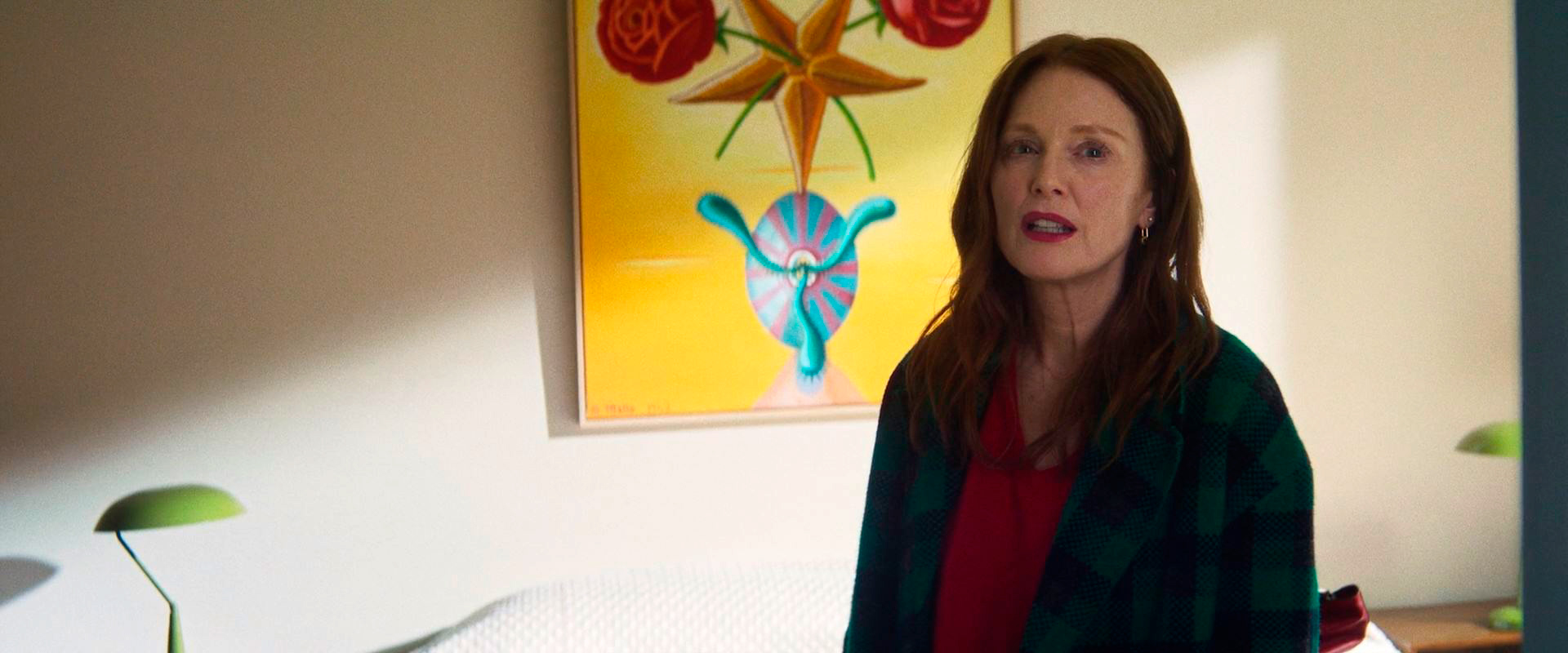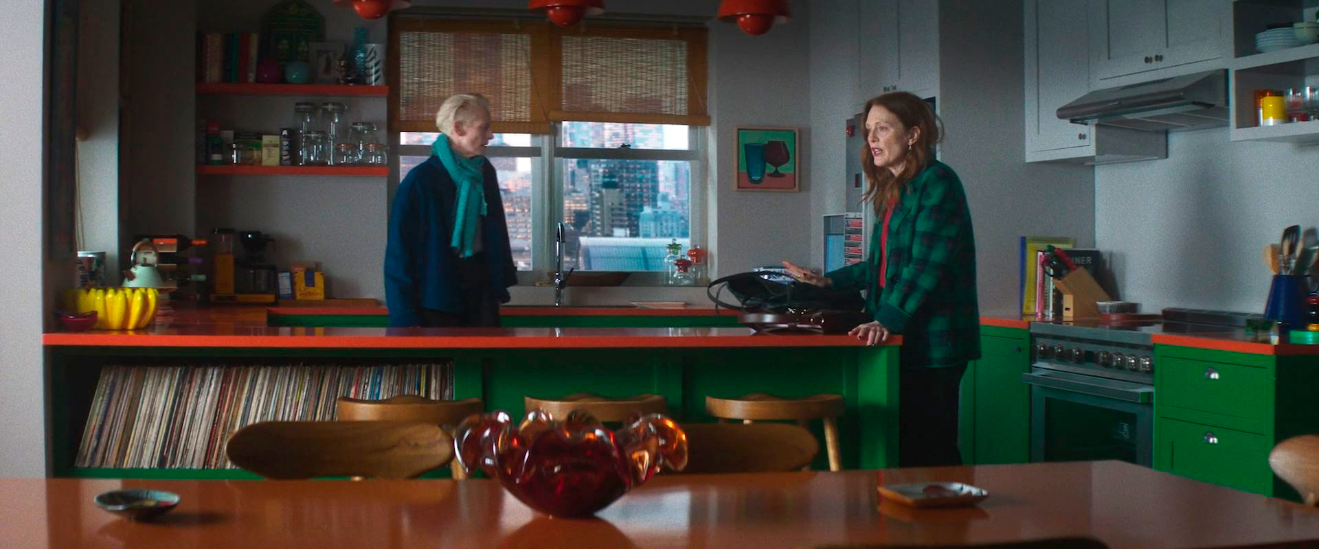 Диалоги между Мартой и Ингрид, скажем честно, не слишком содержательные, хотя там звучит определенный литературно-кинематографический набор из "Мертвых" Джеймса Джойса, Эдварда Хоппера, Вирджинии Вульф с Блумсберийском кружком и фильмов Бастера Китона, но тут Альмодовар не позволяет себе ни малейшей иронии, чего обычно у него в достатке, причем даже в тех фильмах, где говорится о смерти.