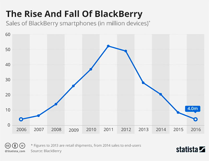 А потом в компании Apple изобрели смартфон нового типа, который назывался айфон, и это было началом конца BlackBerry. К 2016 году доля компании на рынке занимала всего 0,1%, и было принято решение полностью прекратить выпуск смартфонов этой марки.