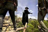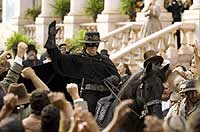 Кроме того, подбавили колорита и второстепенные персонажи: падре, приятель Зорро, который чем дальше, тем круче острил; Макгивенс с деревянными зубами, который с блеском нес звание кинематографического Злодея; ну и сам Арманд, в чьих загадочных масонско-тамплиерских глазах проблескивал весь код да Винчи. Отдельные комплименты юному Хоакину-Алонсо - паренек сыграл просто замечательно.