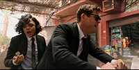 Ну и я молчу о том, что здесь вообще нет никакого внятного главгада: двух призраков с планеты Чих-Пых играют знаменитые танцоры Les Twins, они все время молчат, так что сценаристы себе сэкономили погонные метры диалогов, тем более что неубиваемых призраков позорно слили ближе к финалу. Кстати, в финале тот самый "крот" из лондонского отделения превратился в инопланетного таракана из первого фильма, что мы с Бубликом посчитали откровенным читерством.