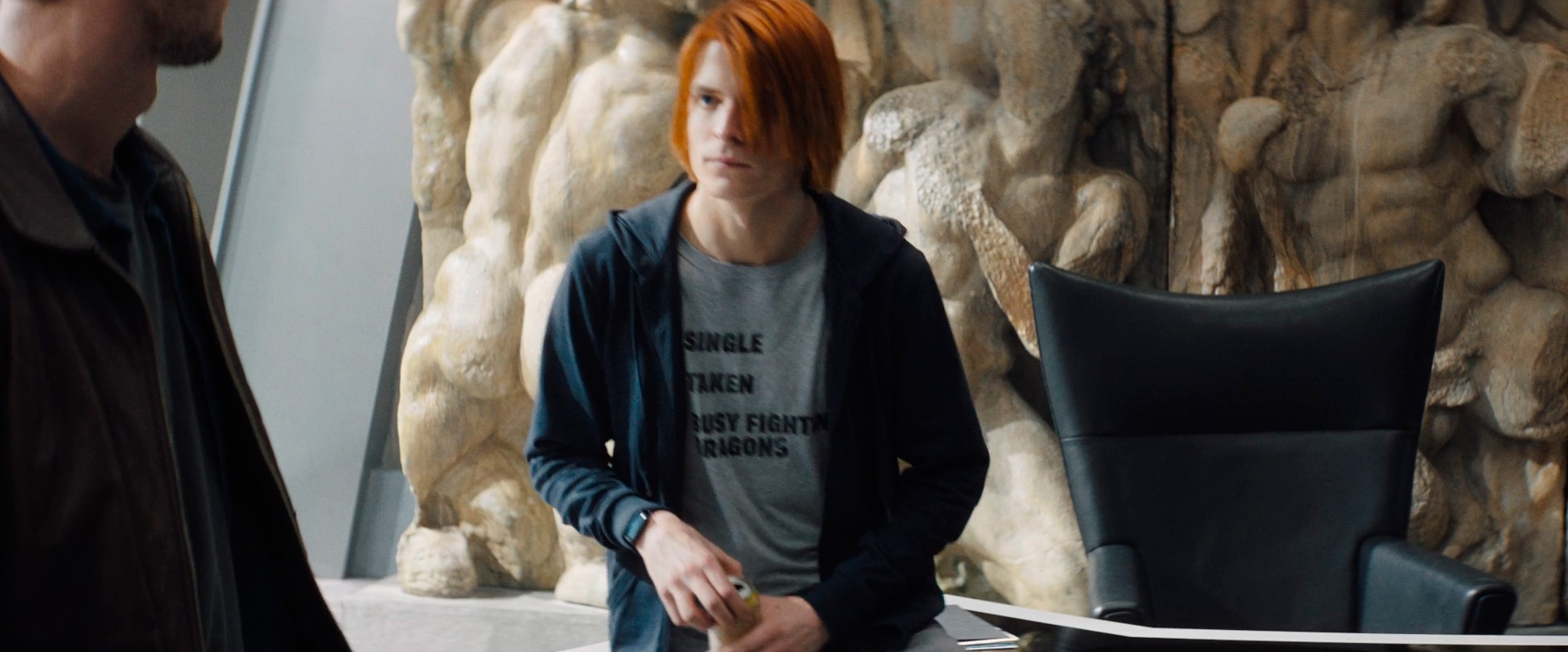 У современного комиксового героя в напарниках должен быть суперхакер (причем обычно - непрерывно острящий) или какой-нибудь тютя, который в нужный момент или совершит подвиг, или придумает совершенно потрясающий план, или сбегает купить шавермы - в общем, сделает что-то такое героическое. Такого персонажа изображал Александер Сетейкин, и его Дима Дубин был чем-то слегка похож на гайдаевского Шурика. Заметную роль в картине он не играл, и я, если честно, не очень понял, зачем его вообще в картину ввели - хватило бы и ютуберши.
