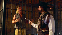 Маршал Картье просит у шерифа разрешения подержать некоторое время этого Краули в местной тюрьме (это просто клетка в офисе шерифа) - мол, они ехали всю ночь, и им надо как минимум поесть и выпить, - при этом мэр категорически против, потому что он понимает, что банда Краули неминуемо и очень скоро нападет на город, - но шериф - существо очень упертое, поэтому он позволяет посадить Краули в клетку и заверяет маршала, что он с негодяя не спустит глаз.