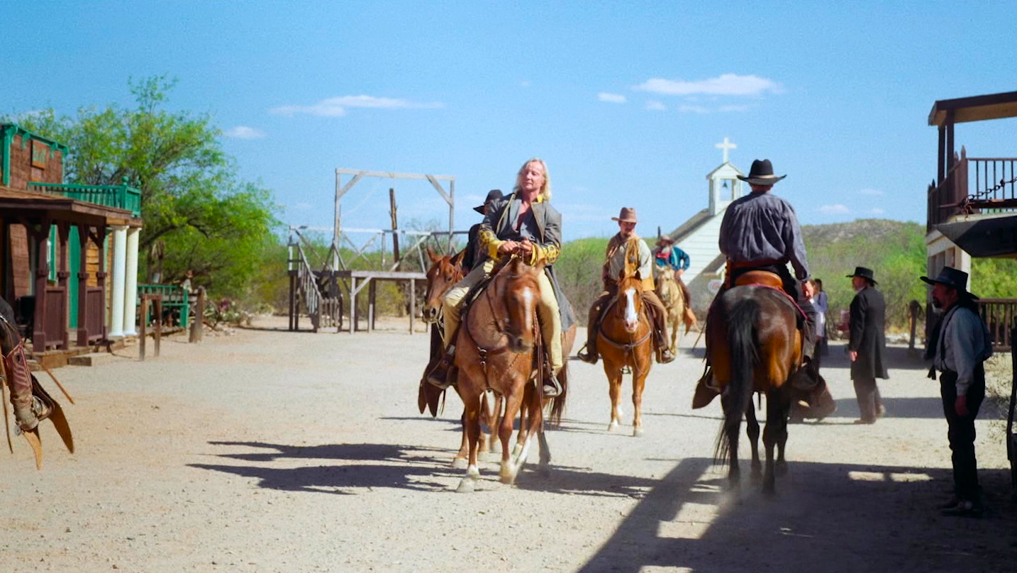 Восточный Техас, 1873 год. По пыльной аризонской пустыне (потому что снимали в Аризоне, а не в Техасе) в телеге едет ковбой Саша (Александр Невский) в зловещей черной ковбойской шляпе. Его нагоняют два нехорошего вида мужчины с ружьями и пистолетами и намекают Саше, что они у него сейчас отберут все что находится в тележке вместе с тележкой. На что Саша заявляет, что он не фермер, а бизнесмен и загадочно советует не прикасаться к его вещам. Тем не менее один из бандитов открывает ящик, лежащий в телеге, и достает оттуда женское платье - это Саша везет реквизит для съемочной площадки.