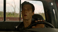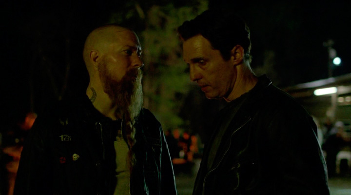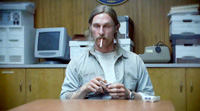 И вот эта внутренняя борьба, эти демоны, это наполовину потустороннее существование - МакКонахи все это изобразил совершенно потрясающе. У него даже характерные жесты этого Расти - яркие, обращающие на себя внимание.