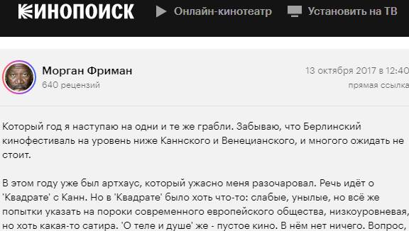 'О теле и душе' же - пустое кино. В нём нет ничего. Вопрос, который преследует зрителя на протяжении фильмы - 'и что?'. События не двигаются, персонажи не меняются. Мысли, как положено артхаусу, нам почему-то не продвигаются. Никакой смысловой нагрузки картина не несёт. Когда проходит 1:10 хронометража, зрителя начинает клонить в сон. Прибавьте то, что фильм снимался только в помещениях, и никакой хорошей операторской работы нам не предлагают, и вы поймёте масштабы бедствия.