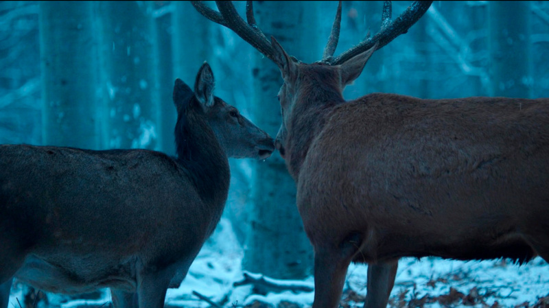 Поставлено и снято это прямо-таки здорово. Фильм длинный, но ничуть, на мой взгляд, не нудный. Он просто созерцательный. Режиссер и оператор Мате Хербаи очень много работают над выстраиванием кадра, над тем, как они показывают героев фильма в случайных отражениях, во всяких нестандартных ситуациях и в моменты их сближения - и это сделано очень красиво и, скажем так, продуманно! То есть это не просто красивые картинки, а это отвечает поставленной постановщицей цели А уж сцены с оленями - они совершенно замечательные.