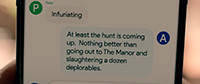 Здесь немало классной сатиры - разговоры старичков на бензоколонке по поводу употребления слов "чернокожие" и "ты пьешь яд", разговоры группы Афины перед засадой и в засаде, да и уже упомянутая литературная беседа Афины с протагонисткой, - боевые действия сняты круто и реалистично, с трешаком слегка переборщили только в начале охоты, а дальше все было аккуратно, реально здорово и безбашенно.