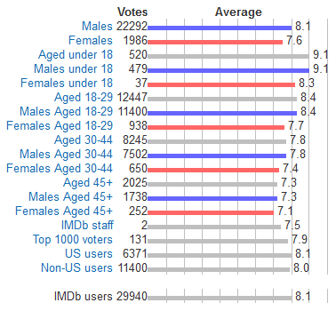 P.S. Рейтинг на IMDB некоторым образом удивляет. И если посмотреть на распределение голосов - становится еще более непонятно. Самые высокие оценки выставляют тинейджеры. Хотя уж им-то картина должна показаться совсем скучной.