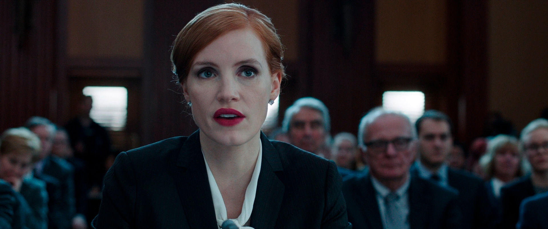 Впрочем, ближе к концу - к этим слушаньям в Конгрессе - сценаристу и режиссеру настолько изменяет чувство меры, что фильм фактически скатывается в фальшивую и совершенно неуместную мелодраму. А мисс Слоун оказывается уже не циничной лоббисткой, а Матерью Божьей, которая положила всю себя на альтарь отечества. И это очень здорово портит впечатление. (О претензиях к сценарию я поговорю в P. S. к данной рецензии, чтобы не спойлерить.)