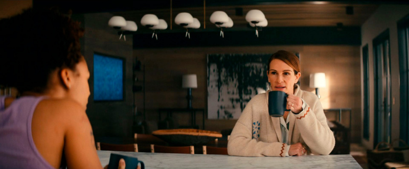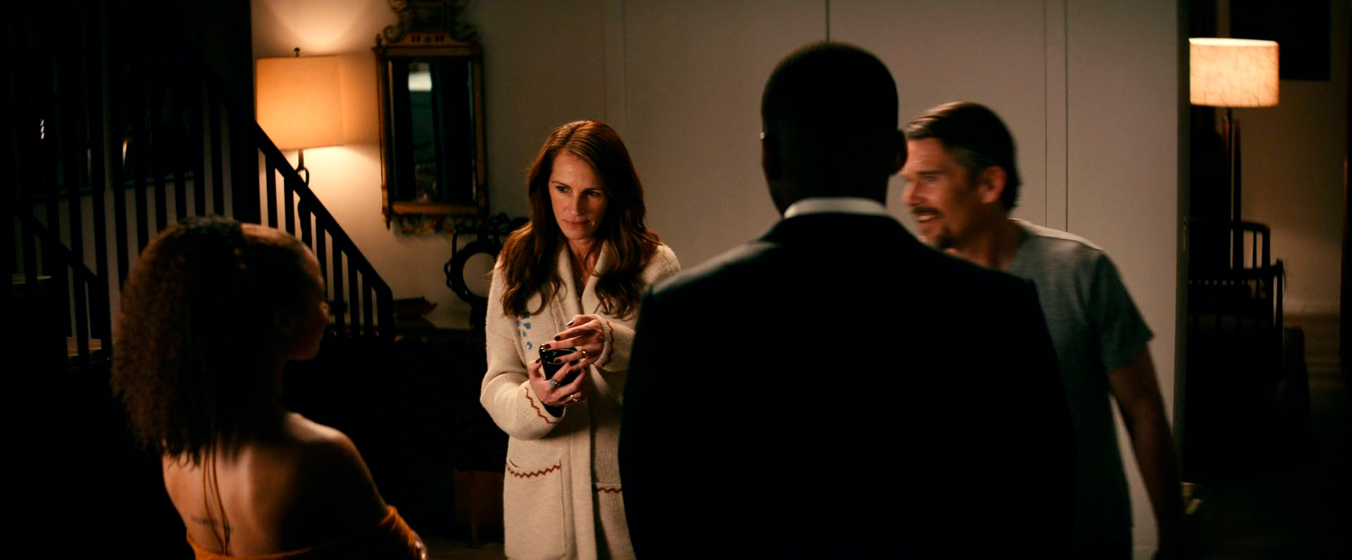 Также здесь еще и возникает неловкая ситуация, когда две совершенно чужие друг другу семьи вынуждены какое-то время находиться в одном доме. Разумеется, некие подспудные конфликты и проблемы здесь имеют место, в том числе и расовые. Героиня Джулии Робертс поначалу не верит, что афроамериканцу может принадлежать такой роскошный и дорогущий дом на побережье, а дочка Рут спрашивает отца: "Когда мы уже выгоним отсюда этих белых?"