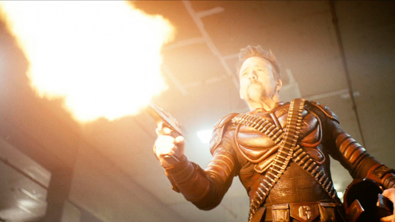 А вот безбашенность, кровавость, брутальность и - что самое, на мой взгляд, главное - жесткая сатира уже безо всяких экивоков и фиг в кармане - с этим тут стало все намного круче, и это очень даже здорово. Продёрнули, причем отлично, тут всех: мегакорпорации, озабоченные рейтингами в ущерб любым представлениям о хоть какой-то социальной справедливости, тупую зрительскую массу, готовую аплодировать откровенно нацистским заявлениям, политиков, военных, да еще и Голливуд в придачу. Всем досталось, как и в отличном фильме "Не смотрите наверх".