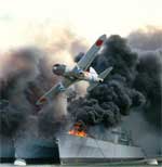 Первый источник - зрелищность и спецэффекты. Ну, тут развернуться всегда есть где, особенно когда на картину дают 140 миллионов баксов и речь идет о войне. Современные средства позволяют минут сорок экранного времени взрывать корабли, самолеты, людей и всякий корабельный инвентарь. При этом самолеты будут пикировать прямо в зрителей, проноситься в метре от земли (даже я, закончив Московский авиационный институт, считаю, что они обычно летают несколько выше), ударяться антенну и от такого жуткого удара отбрасываться назад, словом, ЗРЕЛИЩЕ будет обеспечено. Какая, в конце концов, разница, марсиане бомбят Нью-Йорк или японцы бомбят Перл-Харбор?