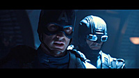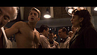 Очень здорово сделан "задохлик" Стив, который потом превращается в мускулистого красавца. Я сначала думал, что создатели фильма взяли какого-то другого актера и его просто гримировали под Эванса, тем более что в кастинге упоминается актер Линдер Дини, сыгравший Стива Роджерса (а заодно и бармена в одном из эпизодов). Однако и по картине хорошо видно, что у задохлика Стива лицо именно Криса Эванса, да и в статье подробно объяснялось, как они это делали: снимался именно сам Эванс, изображение которого потом серьезнейшим образом обрабатывали на компьютере, а Линдер Дини использовался только в некоторых эпизодах, когда требовалось получить соответствующую фактуру. Поэтому у задохлика и лицо Эванса, и натуральная мимика Эванса, и движения.