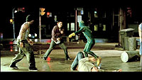 Первая половина просто... неописуемо-хороша! То влияние которое оказывают мельчайшие детали в мимике героев и в интонации их речей (да, смотреть ТОЛЬКО В ОРИГИНАЛЕ!) не передать словами. Вторая половина... у сценаристов есть такое правило: в середине фильма должно произойти некое событие, которое изменяет повествование и направляет его по несколько другому руслу. Так вот сценаристам не стоит забывать, что подобная перемена событий может очень негативно на этом самом повествовании и сказаться. Такое и произошло с "Kick-Ass". Вторая половина в целом хорошая, но хуже куда более удачного старта, с рядом довольно слабых сцен (горящий склад стоит отдельного упоминания, настолько "кукольно" выглядел тот эпизод), но и не без совершенно шикарных моментов! Но финал... финал полный провал. Кажется, что сценарист, что режиссёр вдруг забыли в каком именно ключе они снимают фильм. В целом же по совокупности данных просто отличное кино! Я не просто так выделил слово "просто", читать предыдущее предложение следует с упором именно на него, ведь кино это могло бы стать шедевром. Настоящим шедевром! Впрочем, я как человек читавший сам комикс (а вы ведь в курсе, что это экранизация?!) могу только похвалить создателей за грамотное переложение его содержимого на язык кино. Даже несмотря на то, что снятая один в один по первоисточнику сцена была ровно одна, а образы некоторых персонажей полностью изменили.
