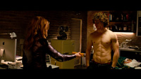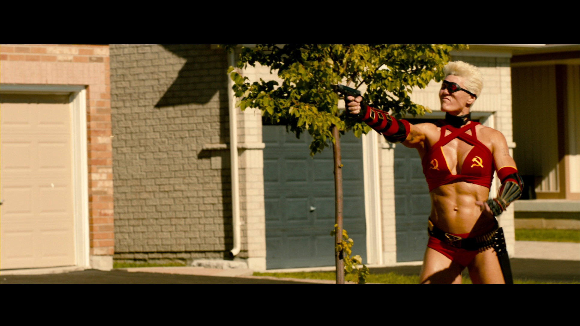 Другой, очень колоритный персонаж в комиксе это Мать-Россия. По сюжету комикса Крис нанимает бывшую телохранительницу Владимира Путина, однако в фильме ей придумали новую биографию. (Или это проделки российского дубляжа? Надо будет в оригинале посмотреть.) А заодно придали внешность бодибилдерши Ольги Куркулиной. Решение, мягко говоря, странное. Актерское дарование госпожи Куркулиной можно сравнить разве что с Арнольдом нашим "Терминатором" Шварценнеггером. То есть, ровно такой же самодвижущийся шкаф, только женского полу. Чтобы шкаф на экране не выглядел шкафом, надо уметь его снимать. Судя по всему, никто из съемочный команды Kick-Ass 2 не имел опыта работы с Арни, так что Куркулину показать с наиболее выгодных ракурсов не смогли. (Крупный план накачанной задницы в красных труселях не в счет.) Особенно это заметно, когда Мать-Россия должна просто присутствовать в кадре. Типичная мебель – как поставили, так и стоит.