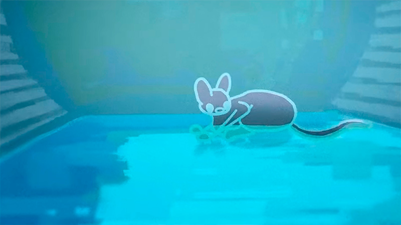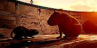 Котик смог убежать от потока и добраться до дома, где он живет, однако вода продолжает прибывать и прибывать, и в конце концов котику снова пришлось спасаться: он прыгнул в лодку, в которой плывет невозмутимая капибара.