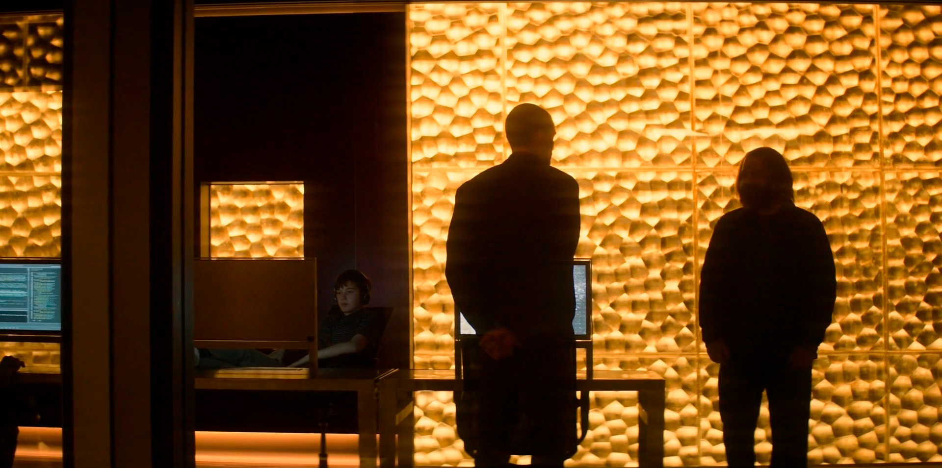 Здесь в "Разрабах" с визуальной точки зрения Алекс Гарленд перешел на совершенно новую ступень. Потому что кроме достаточно захватывающего повествования здесь очень интересная и невероятно красивая работа с картинкой. Завораживающее строение "Разрабов", постоянная игра света на лицах самих разработчиков и Кейти с Форестом, бескрайние городские пейзажи калифорнийских городов, шокирующая гигантская статуя трагически погибшей дочери Фореста, возвышающаяся над лесами, окружающими территорию компании, - ну просто сплошной пир для глаз. Добавьте к этому очень искусно и необычно подобранное музыкальное сопровождение, которое заметно усиливает впечатление... В общем, можно сказать, что по уровню визуального воздействия для меня это один из самых впечатляющих сериалов!