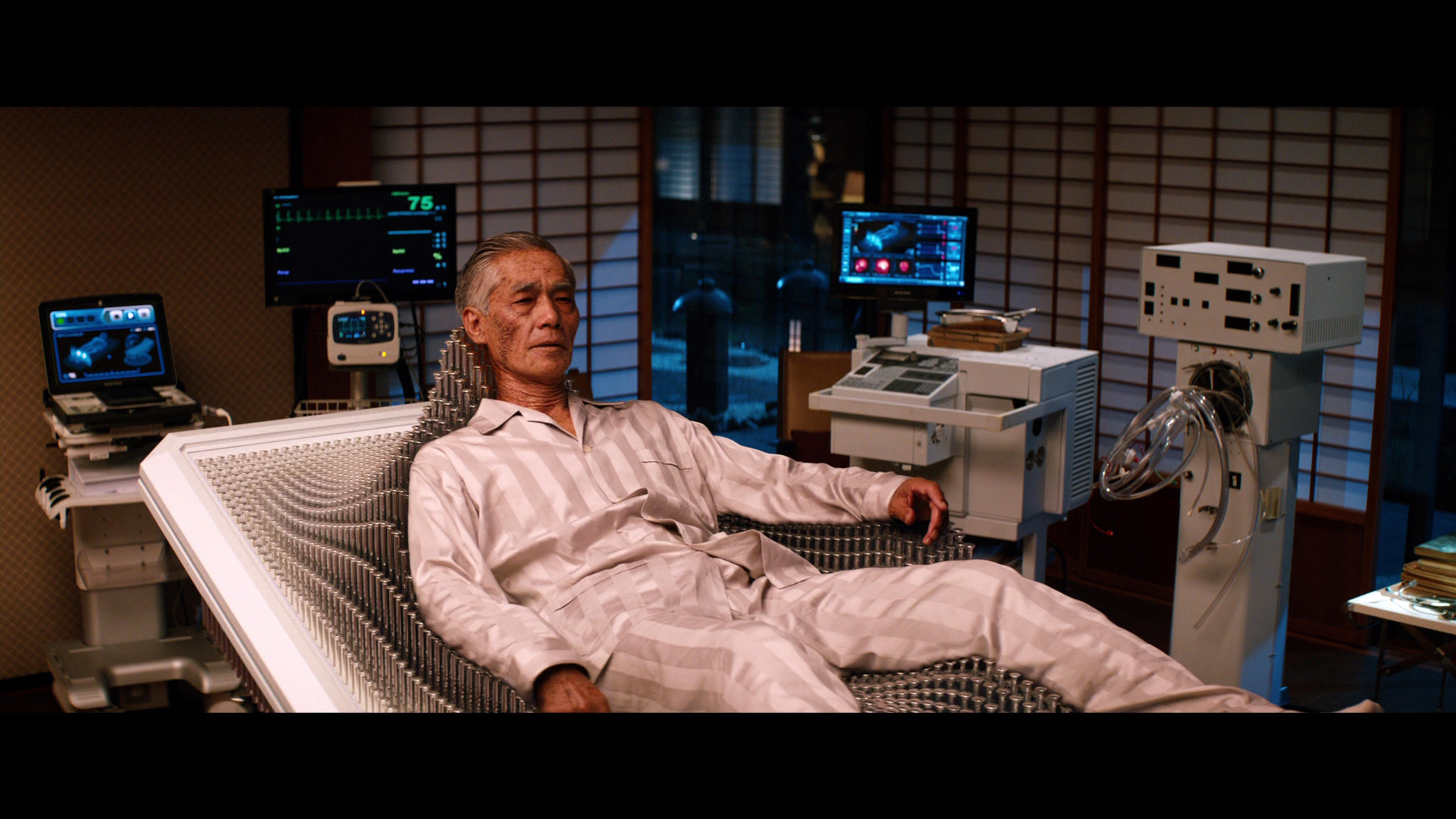 В Японии Росомаху моют в чане с водой две суровые япона-матери, а потом он встречается с помирающим Яшидой. Тот объясняет старому другу, что Росомаха со своим бессмертием наверняка сам себе уже так надоел, что Яшида готов избавить Логана от этого дерьма - взяв себе его бессмертие.