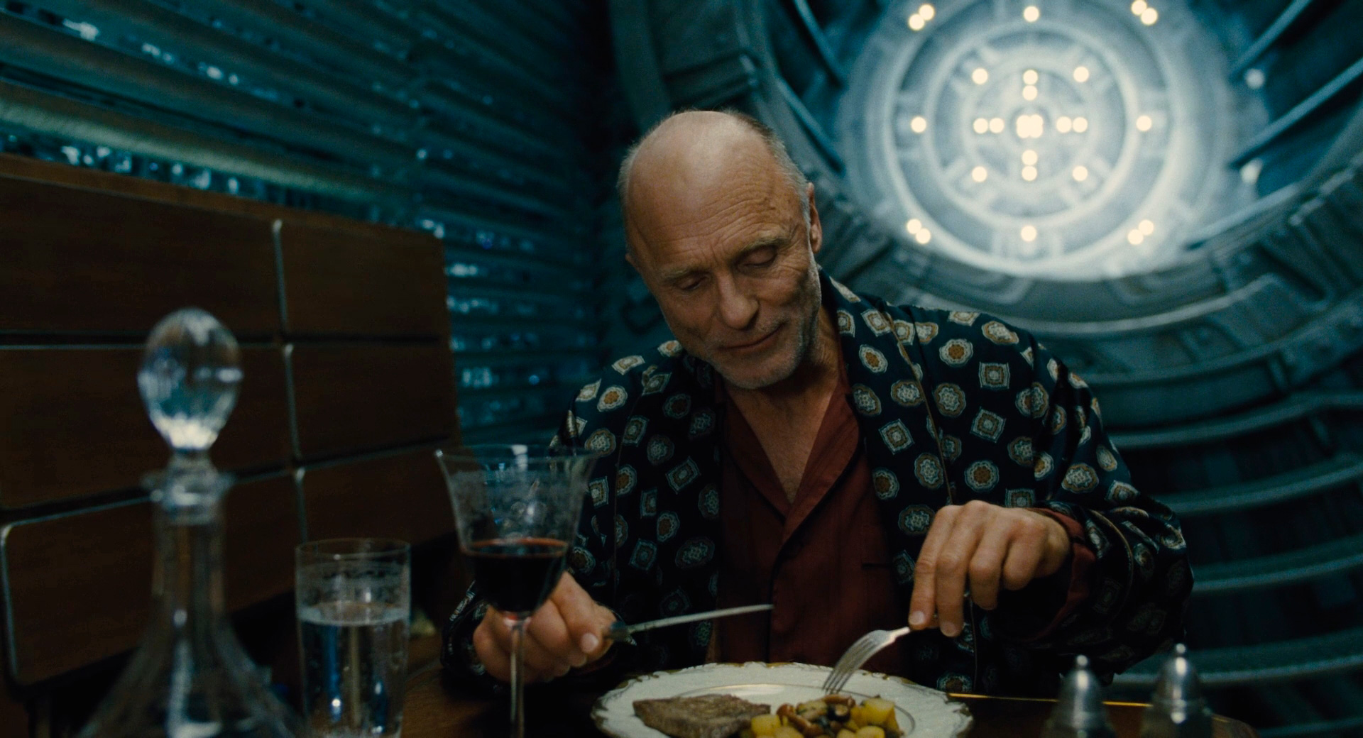 Жизнь низшей касты показана интересно, адское рубилово в преддверии счастливого Екатерининского моста - снято очень мощно и по-корейски кроваво и натуралистично, молчаливый убийца Франко получился эффектным и неотвратимым (его сыграл румын Влад Иванов), вагоны ближе к голове поезда были сделаны с хорошей выдумкой, и все смотрелось очень увлекательно до того момента, пока Кертис с немногочисленными выжившими повстанцами не дошел до двери с огромной буквой W, за которой скрывается Священный Двигатель и сам Уилфорд, великий и ужасный.